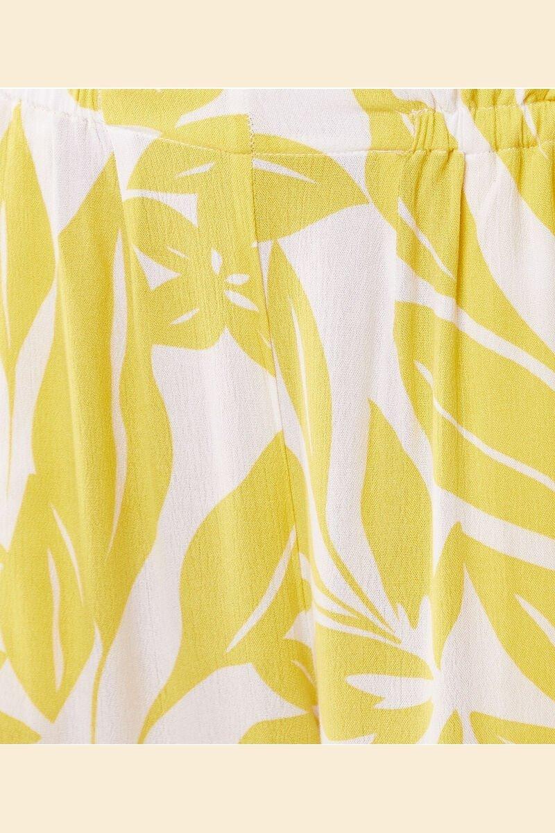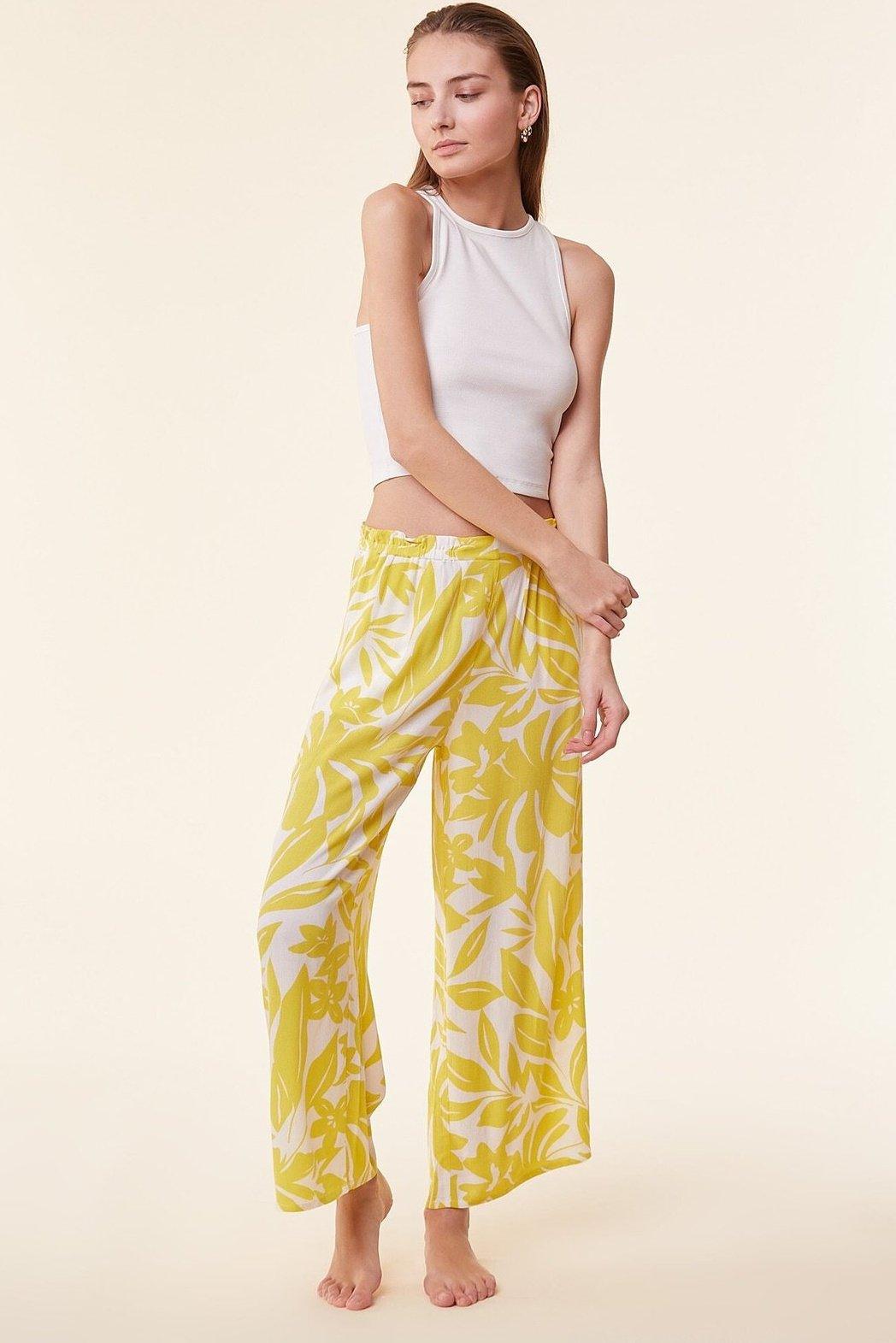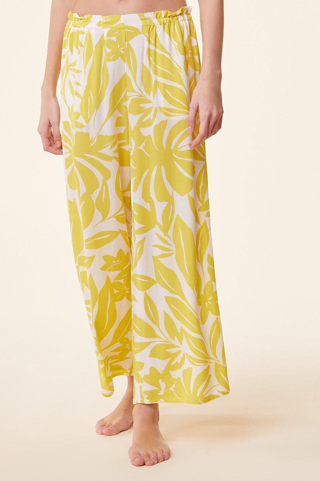 מכנסי פיג'מה בהדפס עלים עלים אקזוטי בצבע צהוב מבית המותג ETAM, עשויים בד ויסקוזה דק ונעים. המכנסיים באורך 7/8 בגזרת שרוואל רחבה ונינוחה, עם מותן אלסטית ושני כיסים