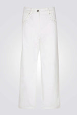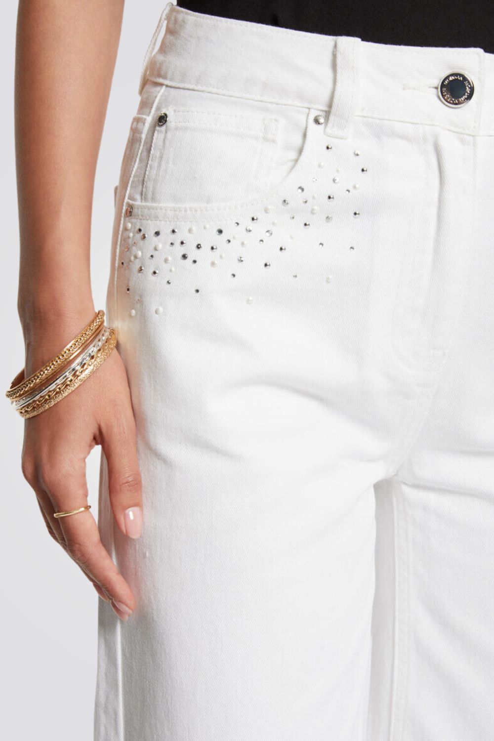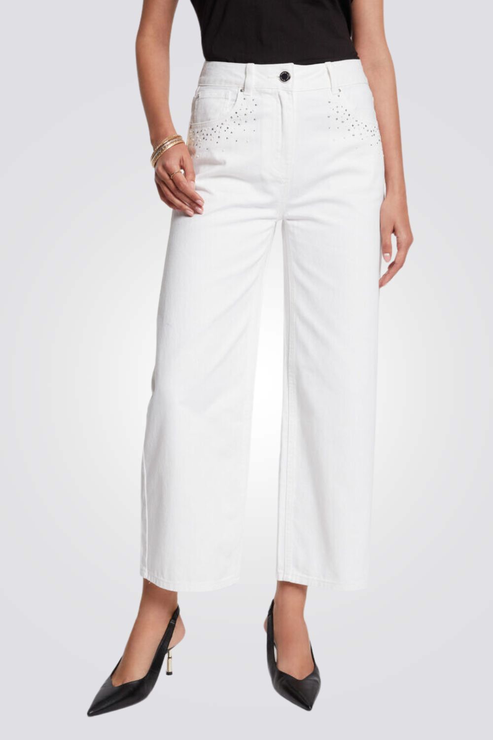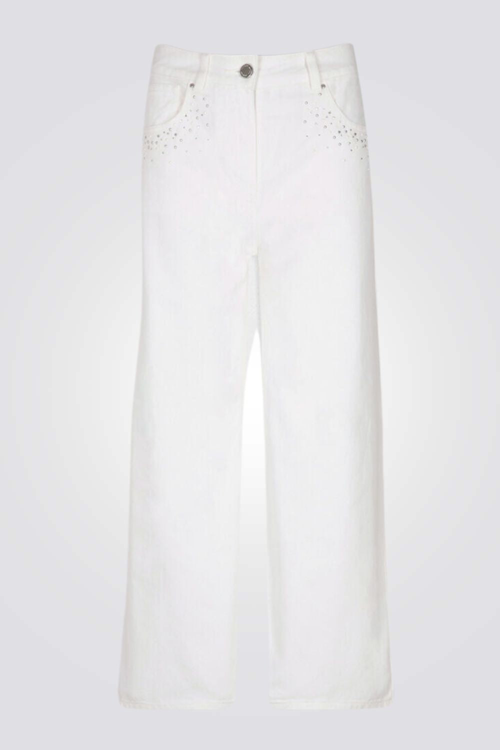 ג'ינס רחב לבן 7/8 מבית המותג MORGAN, מועטר באבני ריינסטון בקדמת המותן. בעל שני כיסים מקדימה ושני כיסים מאחורה. בעל סגירת רוכסן וכפתור בחזית.