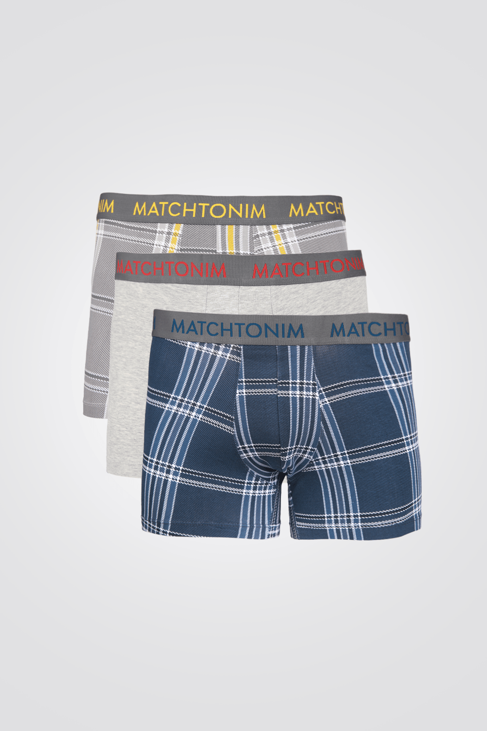 שלושה תחתוני בוקסר צמודים וקצרים מכותנה אלסטית לנוחות מירבית, עם מוטיב משבצות.