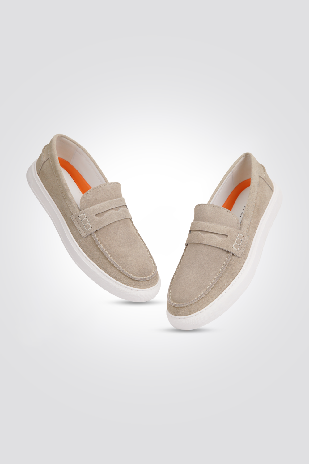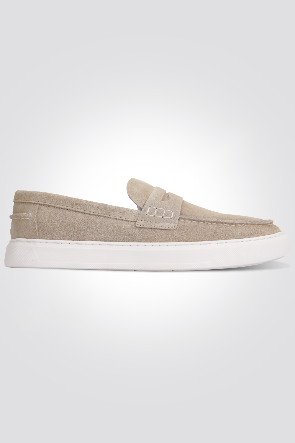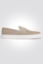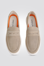 נעלי מוקסין לגבר מהבית המותג היוקרתי KENNETH COLE עשויות עור הפוך בצבע בז' וסוליה בצבע לבן.