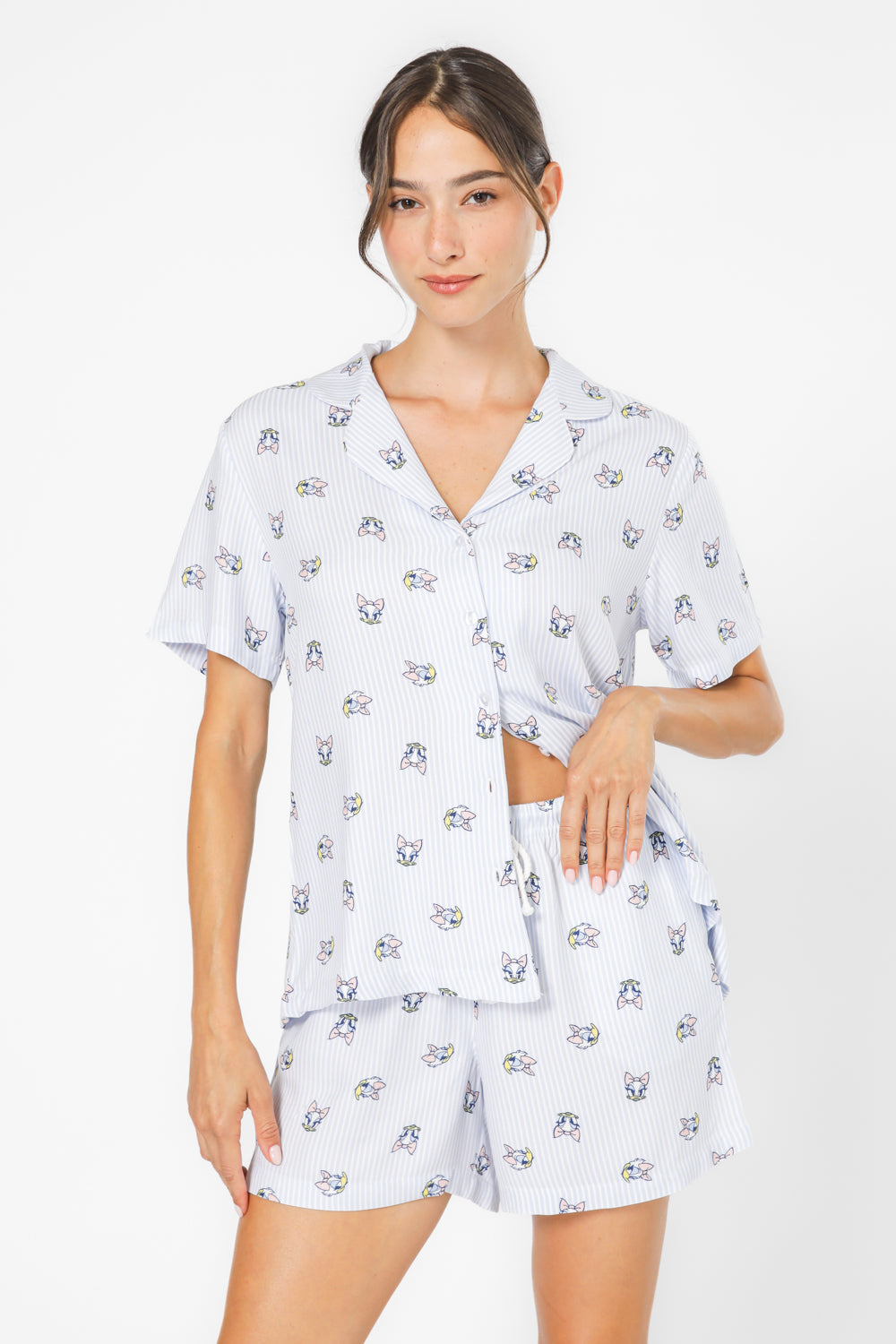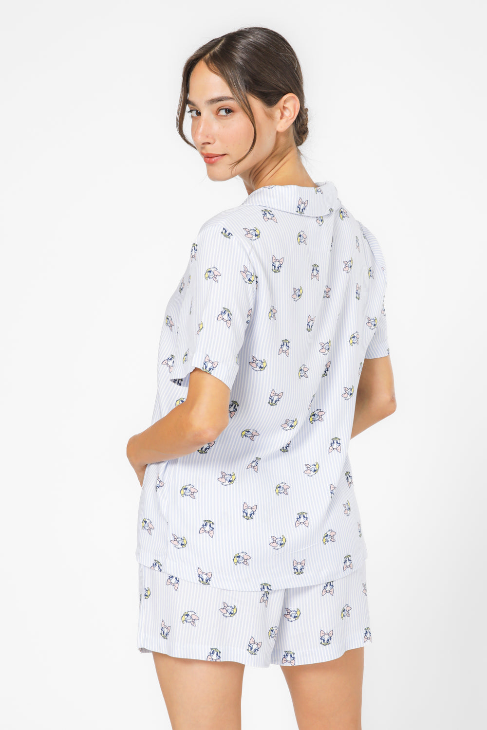 חולצה מכופתרת עם צווארון משולשים ושרוולים קצרים ומכנסיים קצרים.