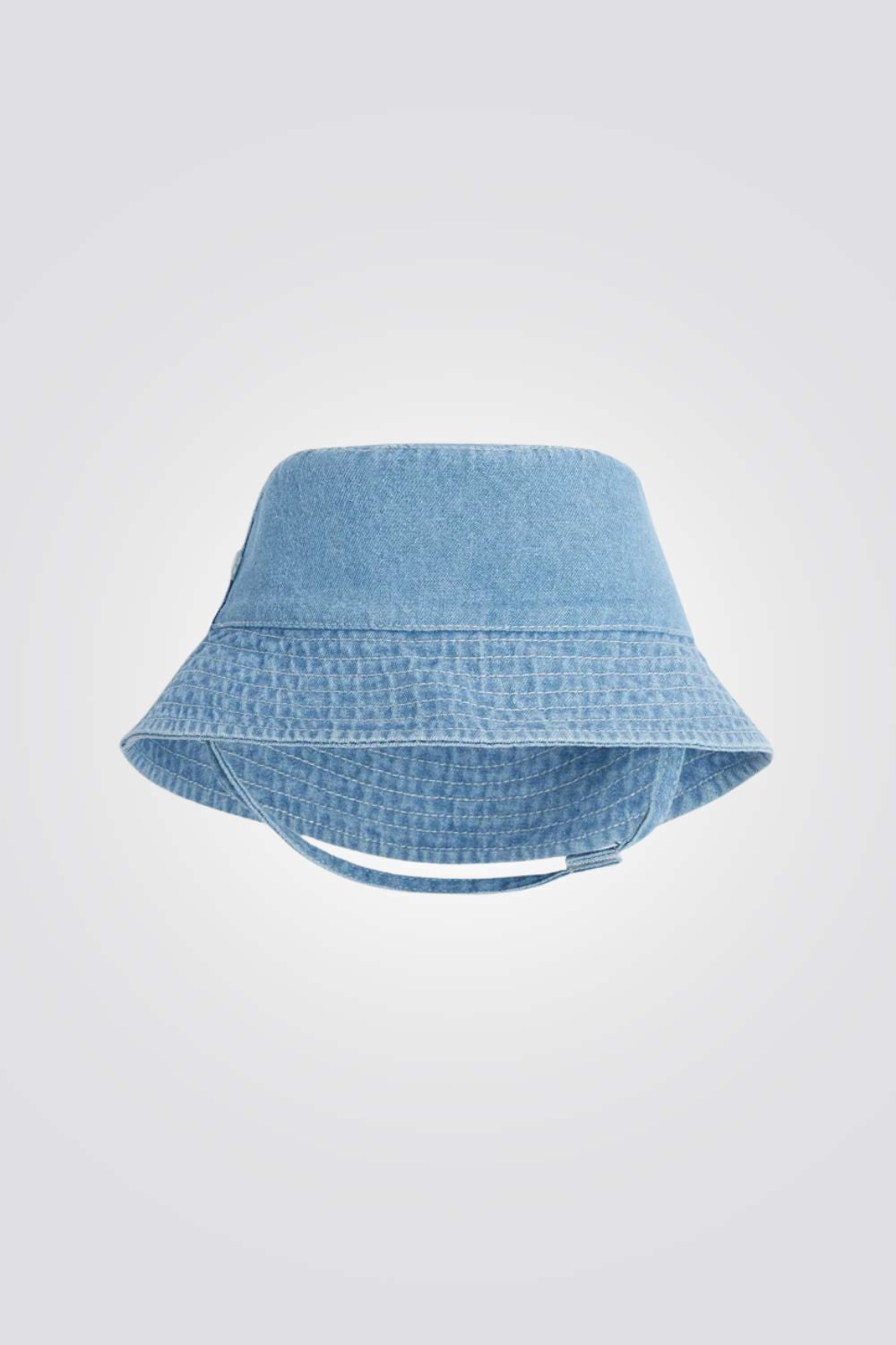 כובע ג'ינס עם שוליים לתינוקות מבית המותג OBAIBI, עם רצועות סקוטץ' לתמיכה .