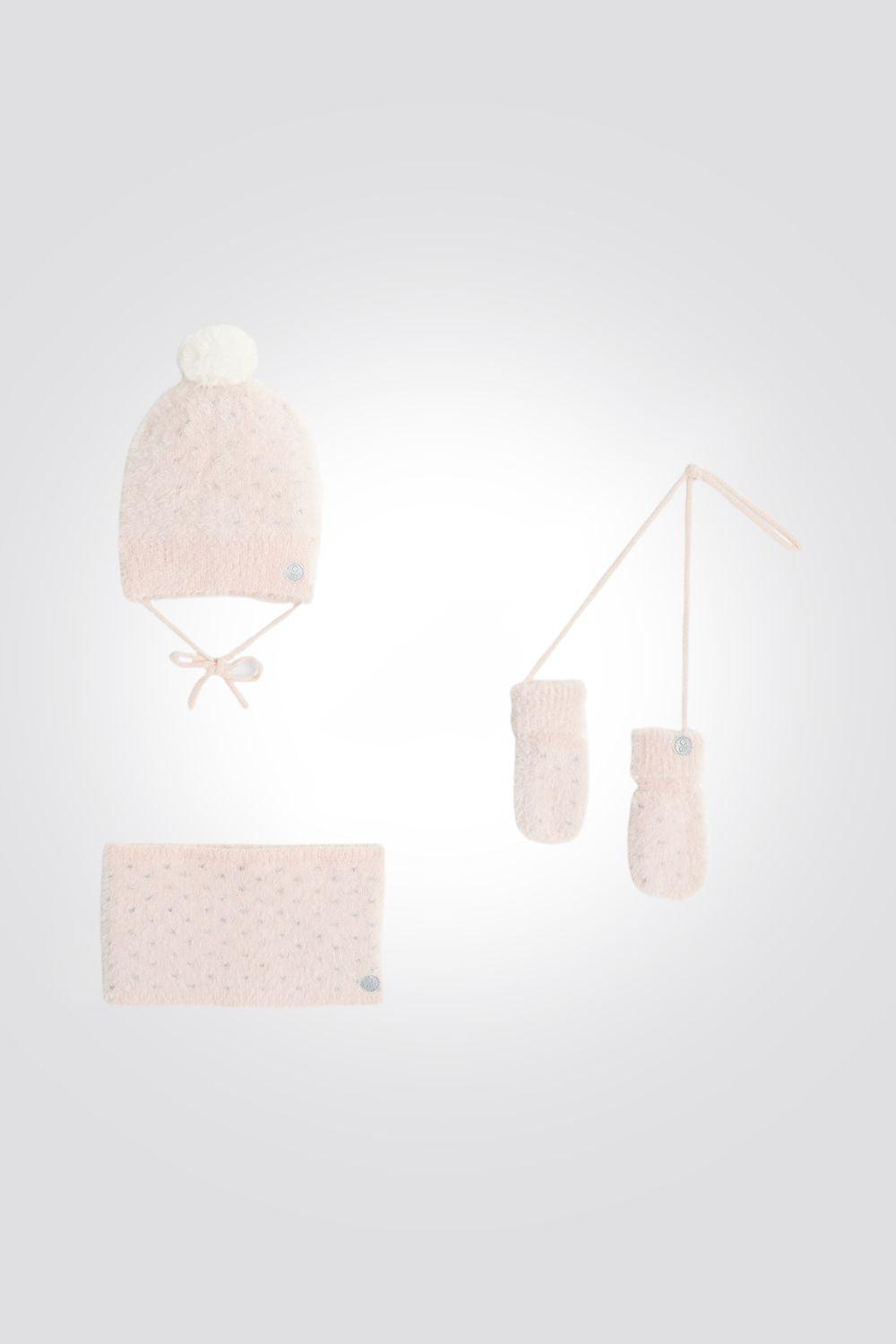 סט מתוק של כובע צמר עם פונפון וחוט קשירה, חם צוואר וכפפות בצבע ורוד בהיר לתינוקות בנות.
