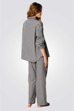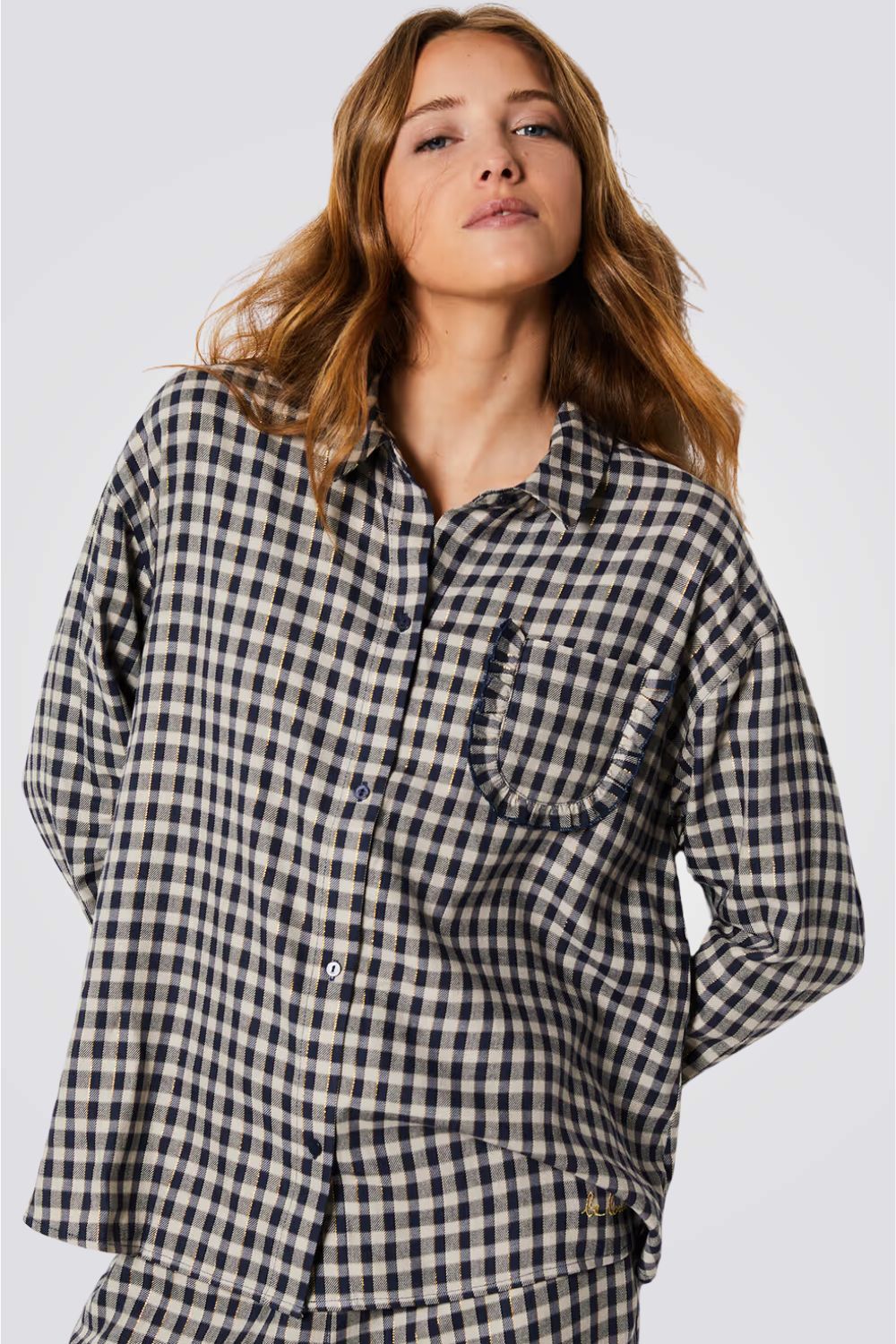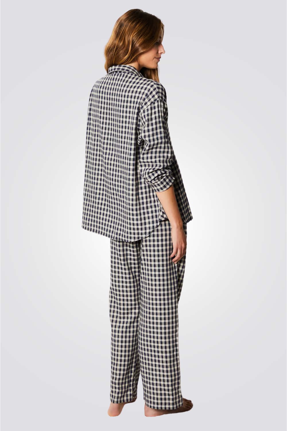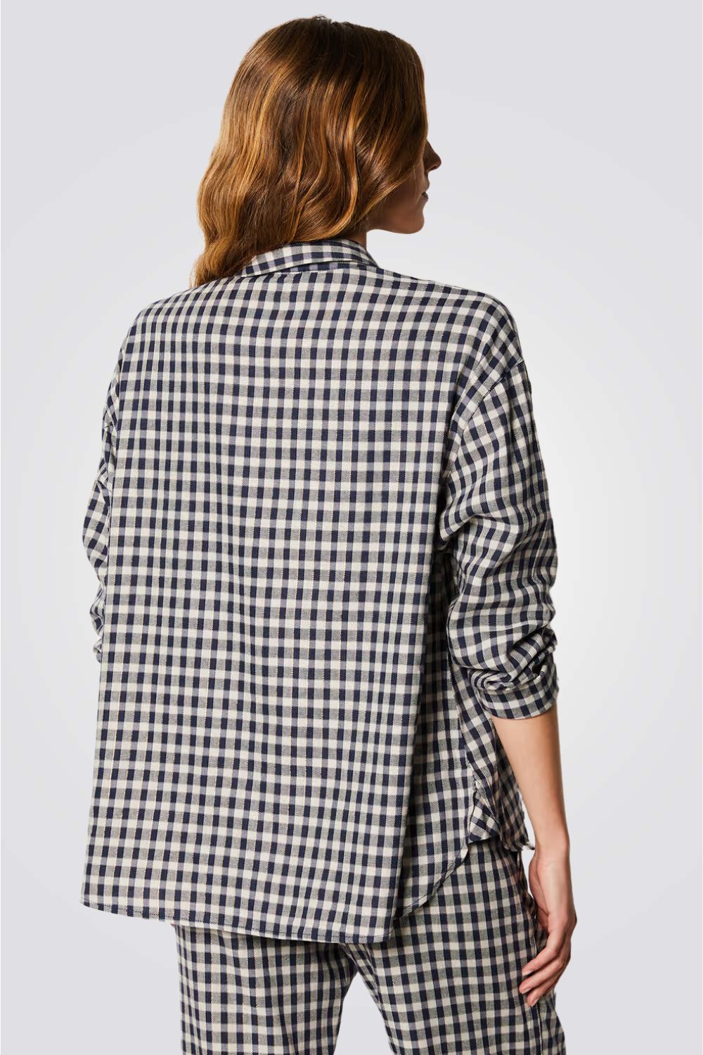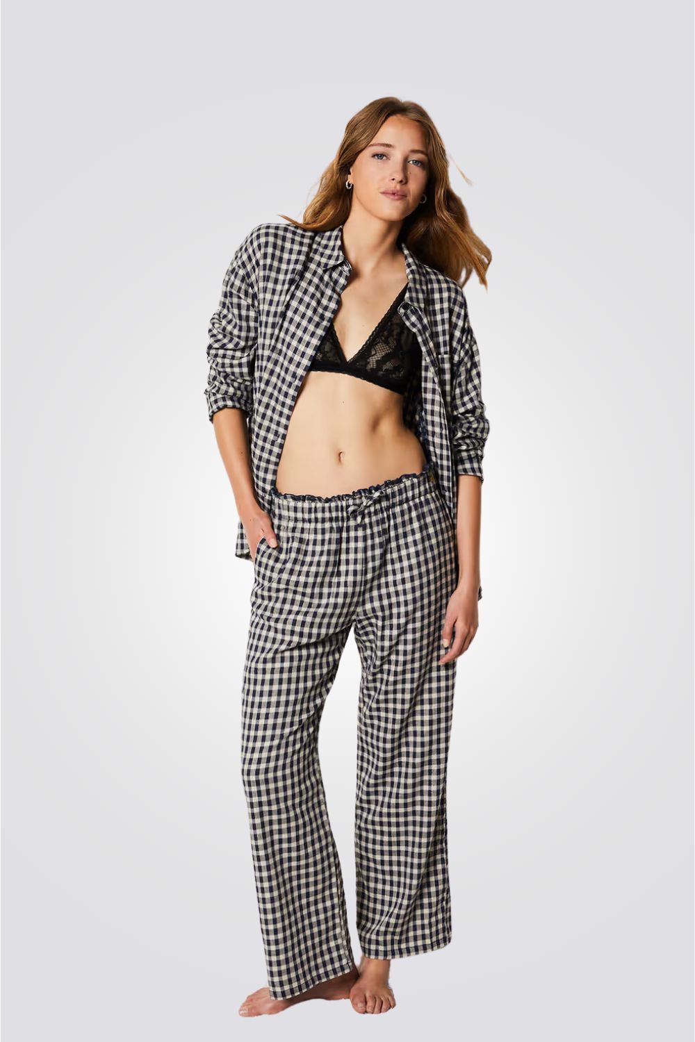 חולצת פיג'מה לנשים מבית המותג הצרפתי ETAM בעלת שרוולים ארוכים, כיס קטן בחלק העליון ובהדפס משובץ שחור לבן.