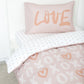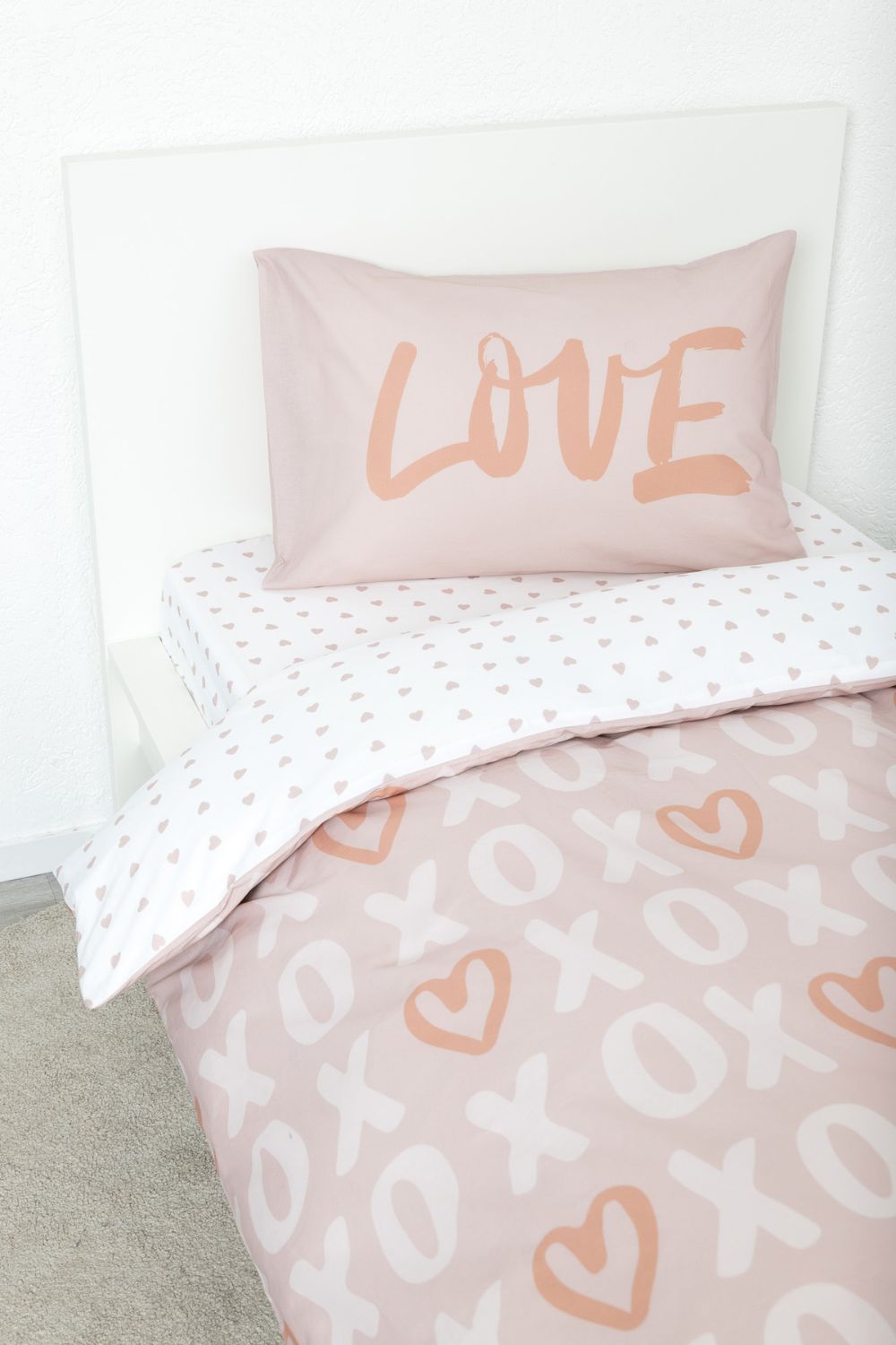 סט מצעים יחיד לילדים ונוער מבית המותג RED CHILLI, דגם LOVE, מבד כותנה בצבעי ורוד ולבן בהדפס לבבות.