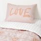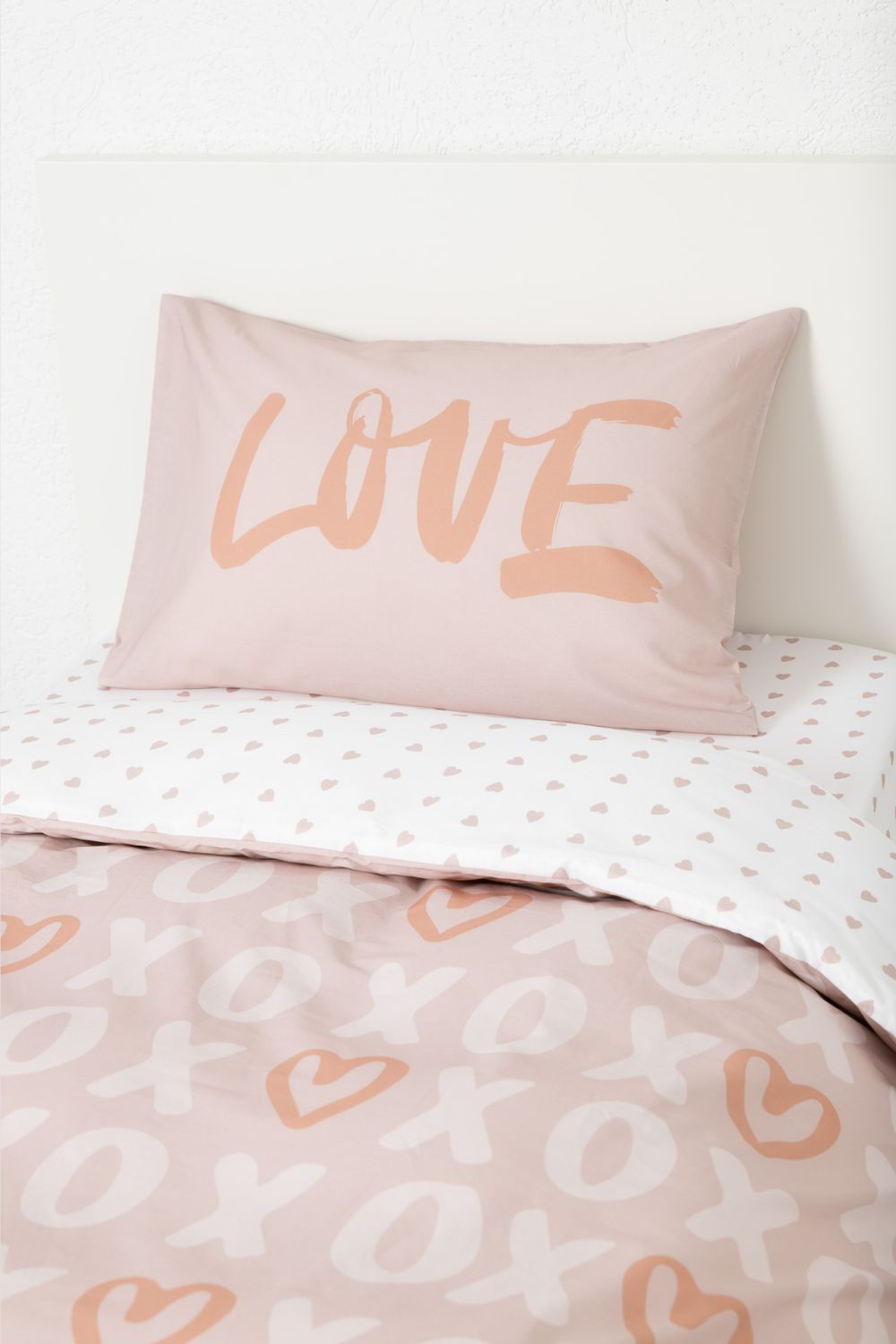 סט מצעים מיטה וחצי לילדים ונוער מבית המותג RED CHILLI, דגם LOVE, מבד כותנה בצבעי ורוד ולבן בהדפס לבבות.