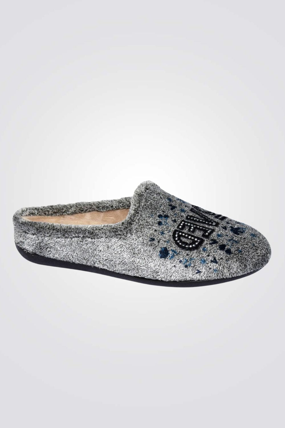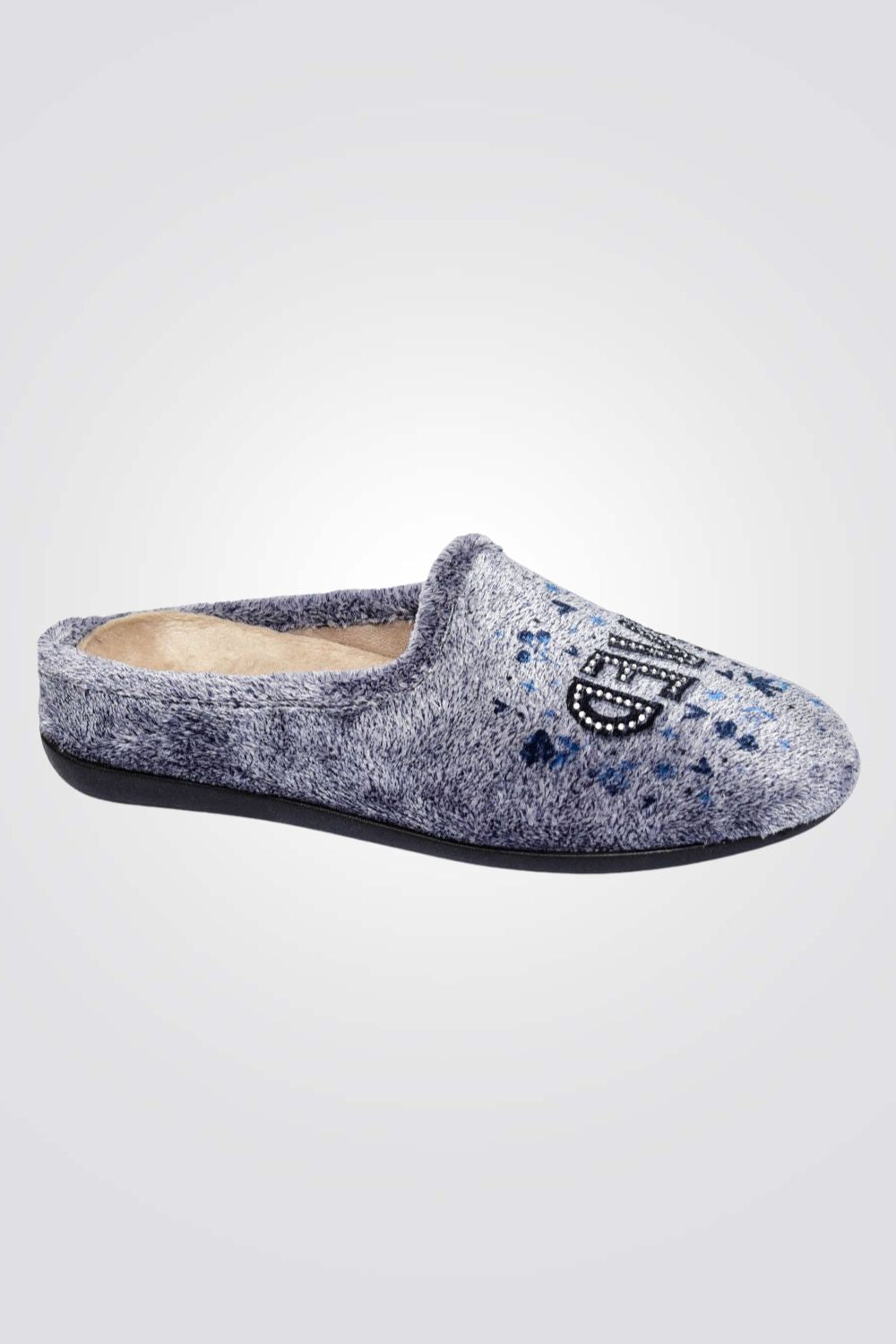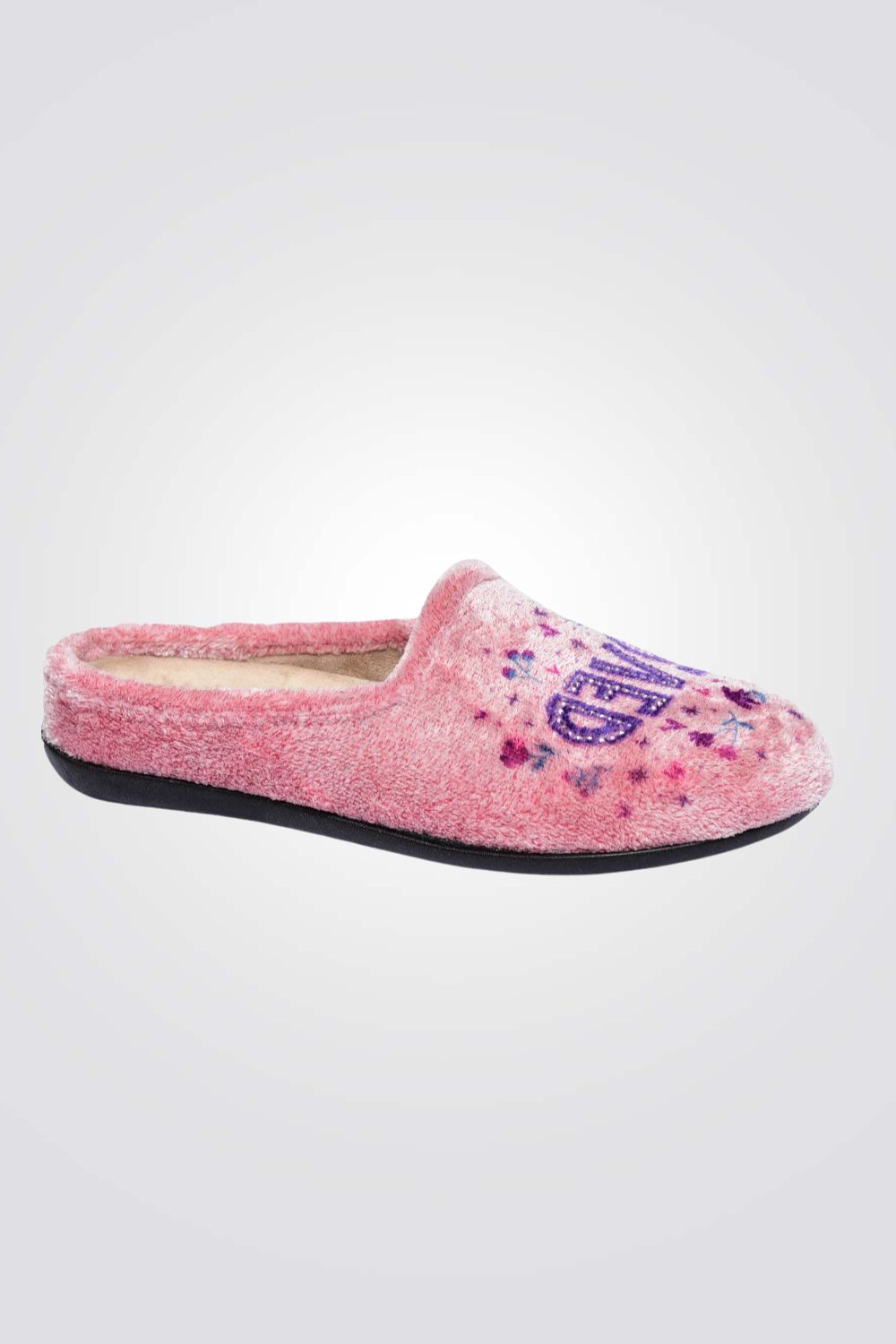 נעלי בית לנשים מבית המותג LADY COMFORT, עם מעטפת פלאפית, וכיתוב LOVED דקורטיבי בחזית.