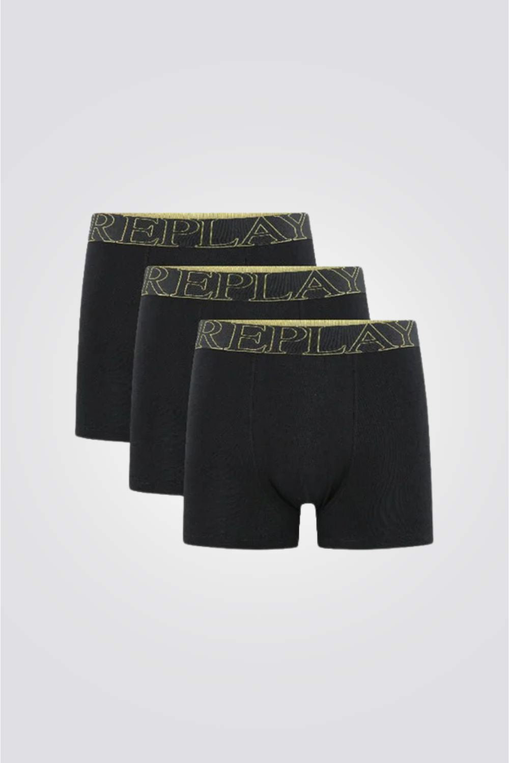 מארז תחתוני בוקסר לגבר מבית המותג REPLAY בצבע שחור ושילוב גומי בקו המותניים.