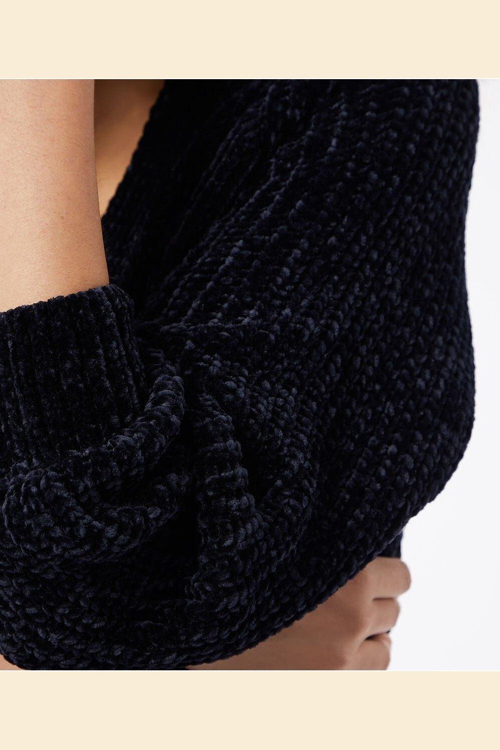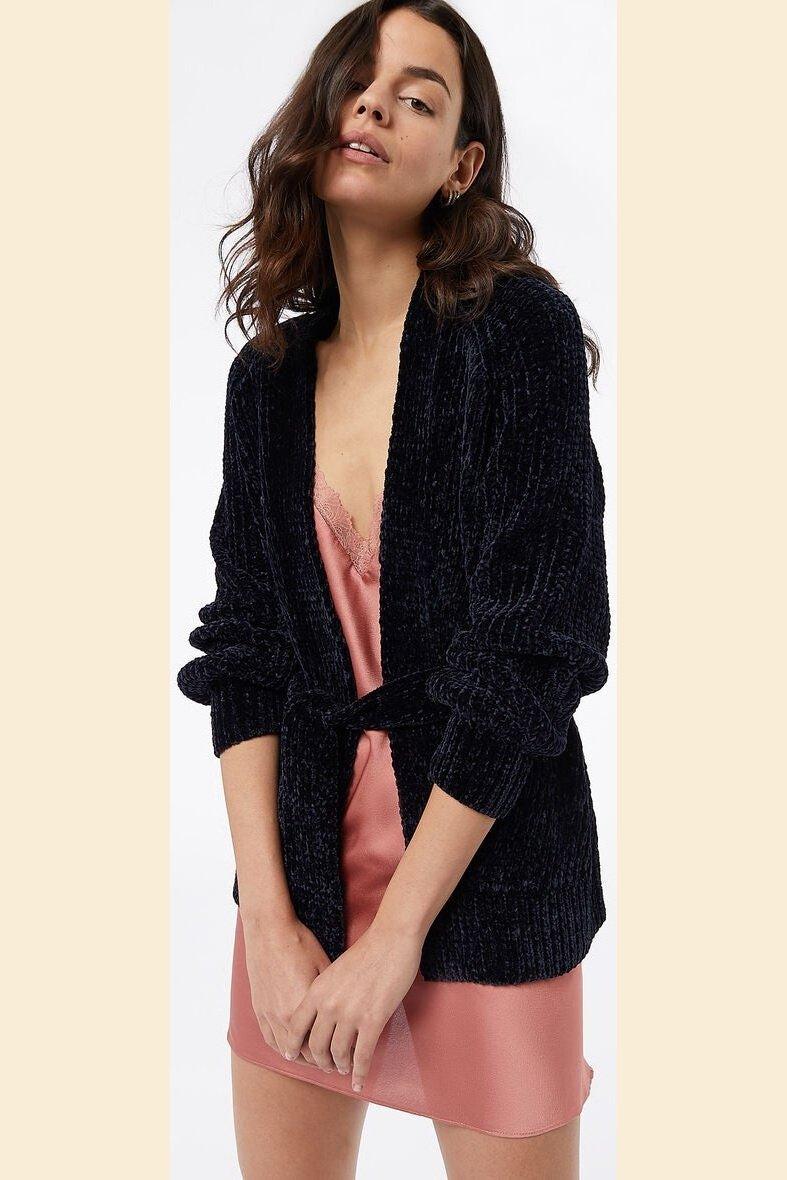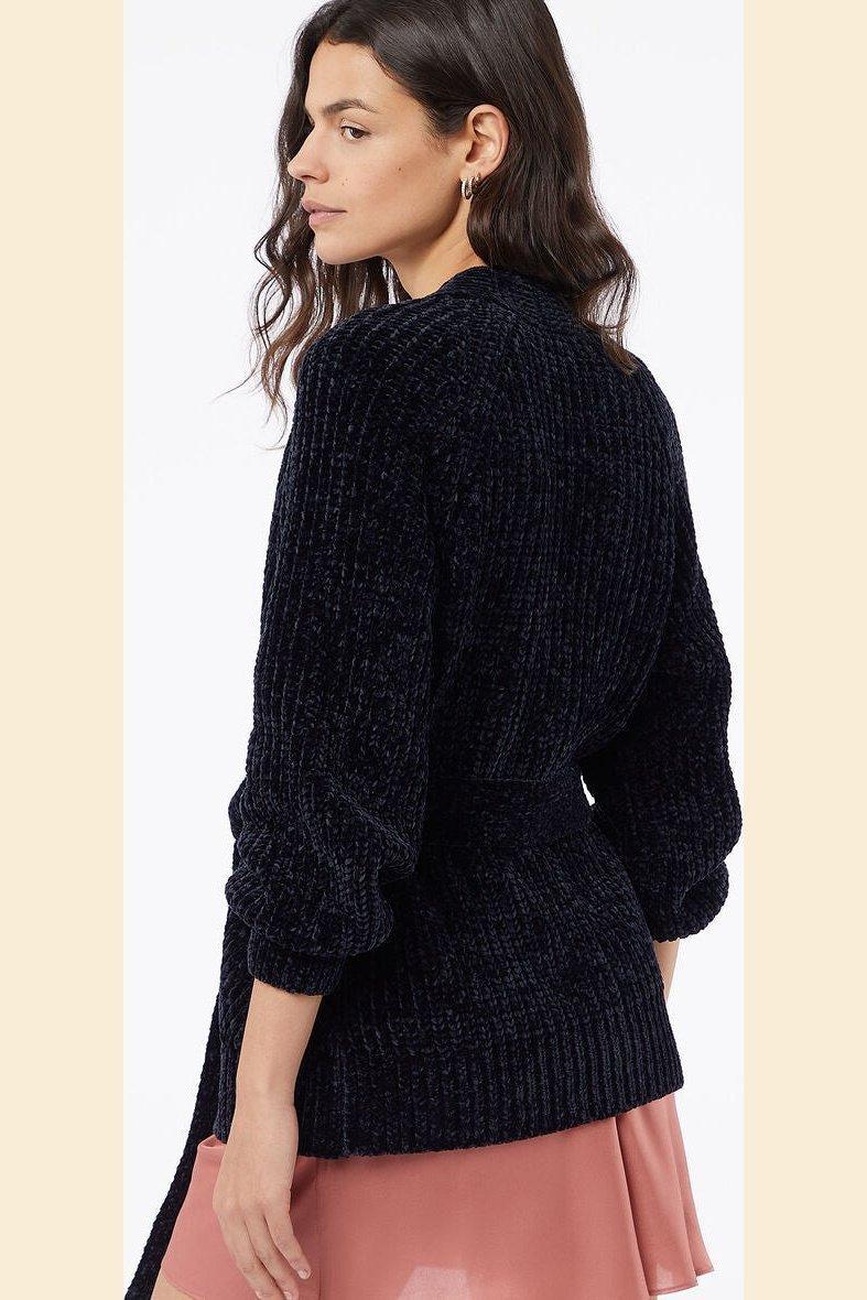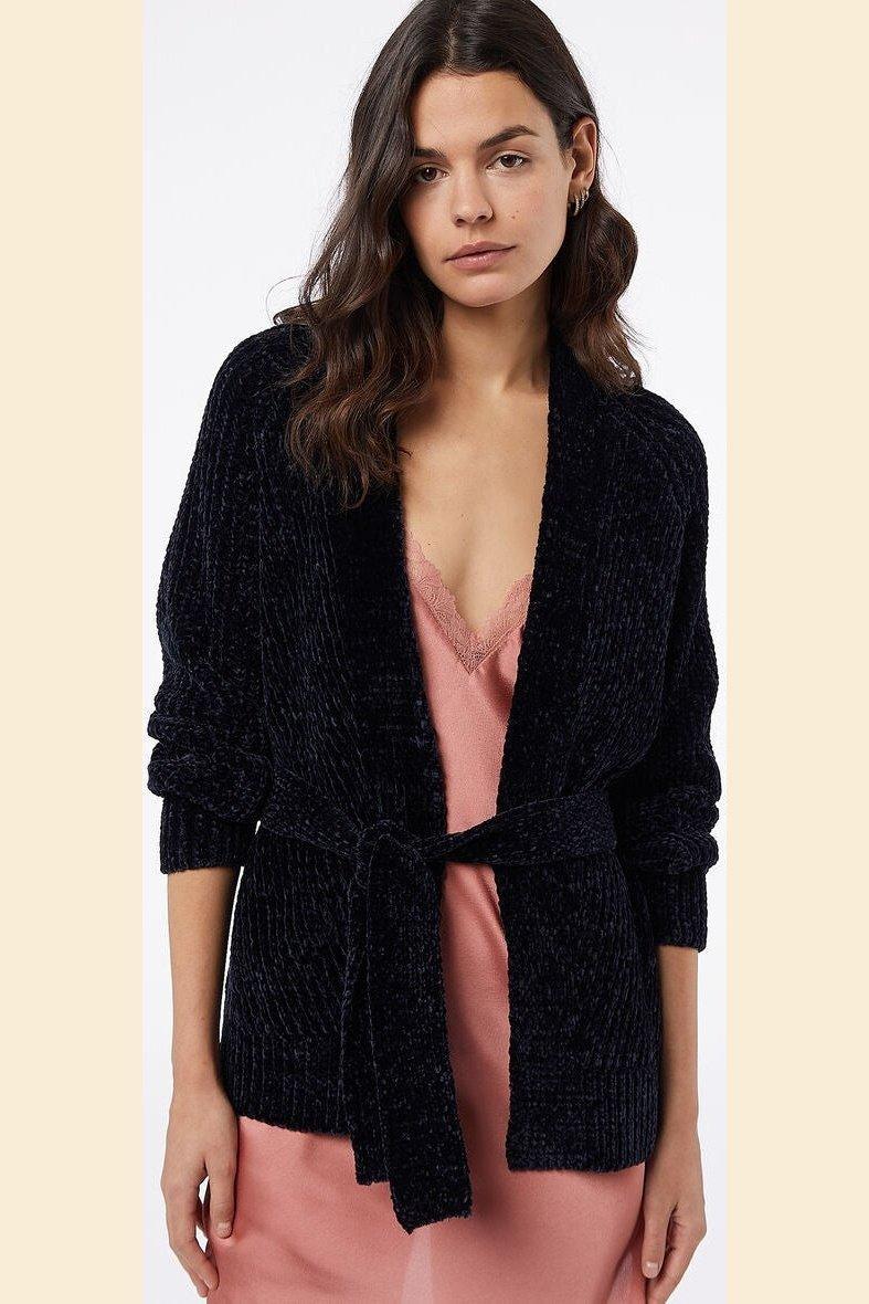 סריג קרדיגן רך וחמים, במגע קטיפתי, מבית המותג הצרפתי ETAM, בגזרה ארוכה מתחת לקו המותן, שרוולים בסיומת מנג'ט וחגורת קשירה במותניים.