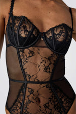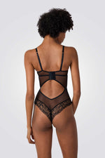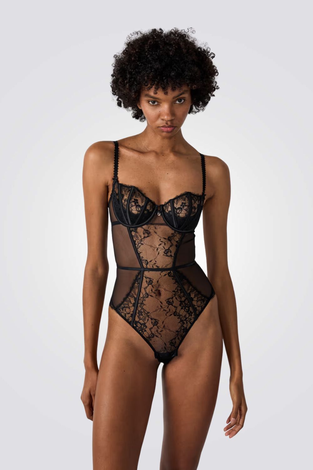 בגד גוף ללילה מבית המותג ETAM, העשוי מבד טול חצי שקוף ומתחרה פרחונית עדינה, בעל ברזלים לתמיכת החזה, כתפיות דקות ומתכווננות, מפתח גב V וטבעת קטנה במרכז.