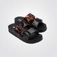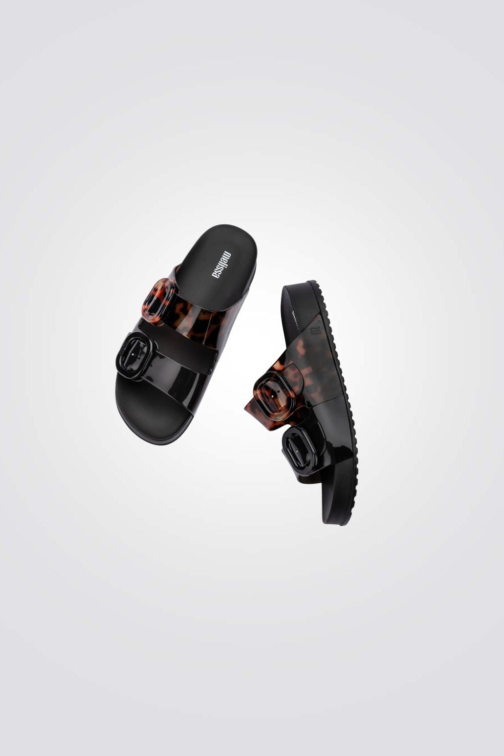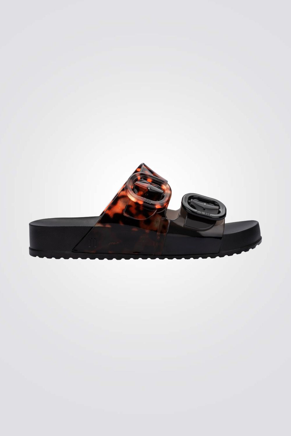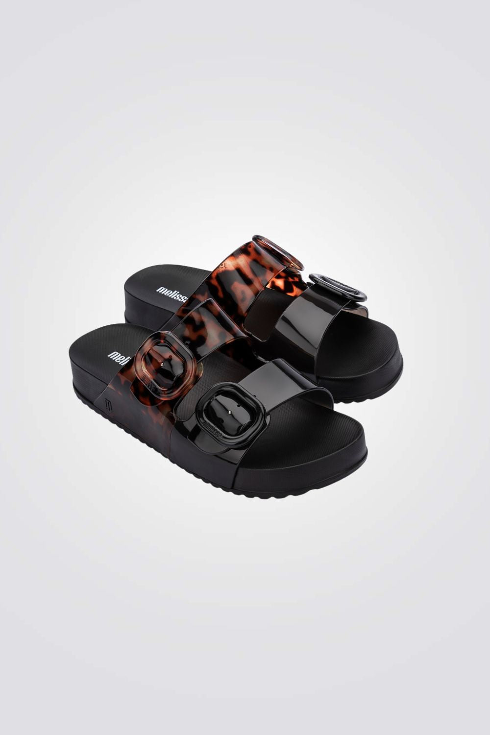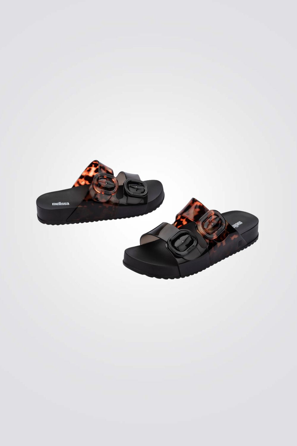 כפכפים לנשים מבית המותג MELISSA, בצבעים שחור ומנומר, עם 2 רצועות אבזם מתכווננות וסוליית PVC להליכה יציבה ונעימה.