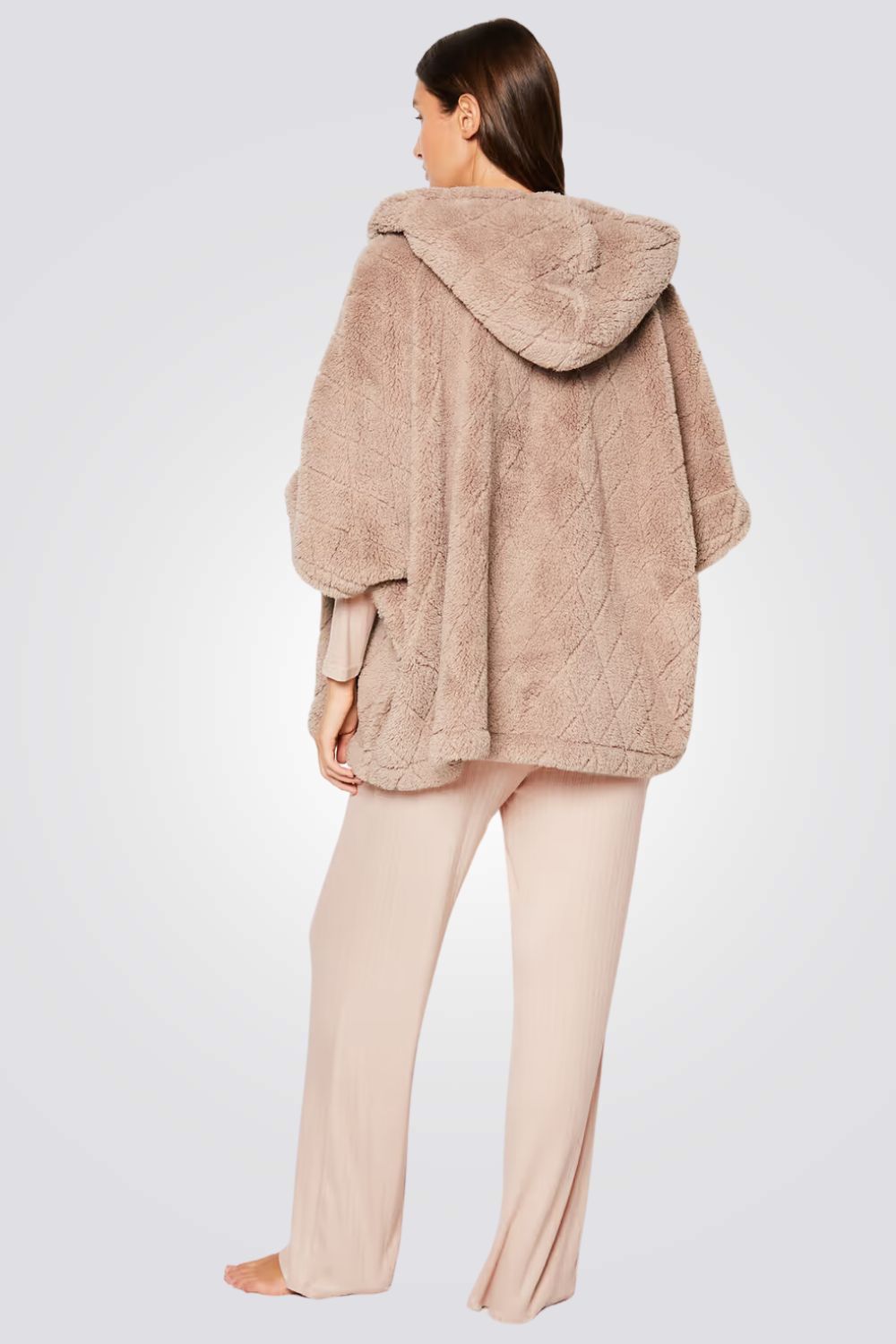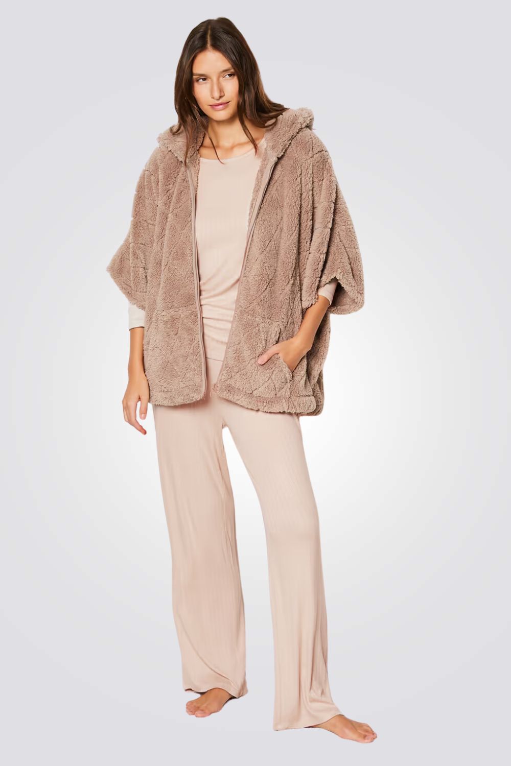סט פיג'מה שלושה חלקים לנשים מבית המותג ETAM בצבע חום, סט המכיל חולצה ומכנס פיג'מה ארוכים מבד רך ונעים וסווטשרט צימרי עם קפוצ'ון מפנק.