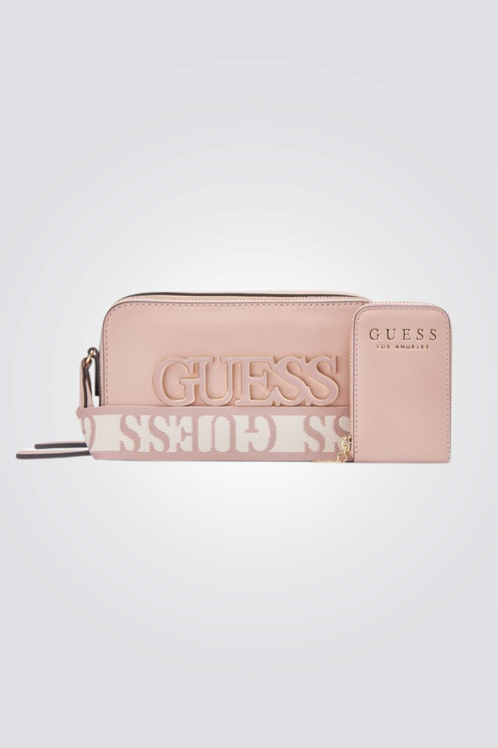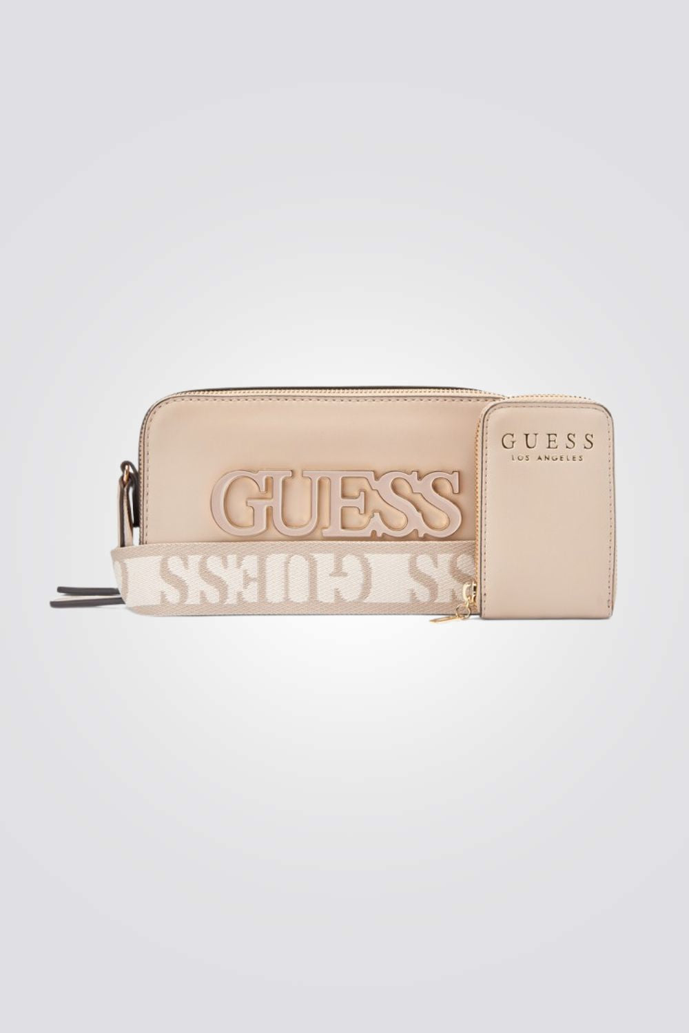 תיק צד לנשים מבית המותג GUESS , בעיצוב קלאסי ונקי, עם לוגו המותג ,תא ראשי וסגירת רוכסן, רצועת צד וארנק קטן מחובר.