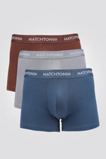 מארז שלישיית תחתוני בוקסר קצרים וצמודים מבית המותג MATCHTONIM עשויים מבדסינגל ג'רסי נכים ורכים בצבעים אדום אפור וכחול.