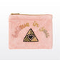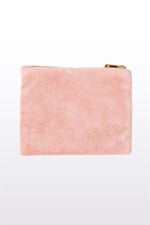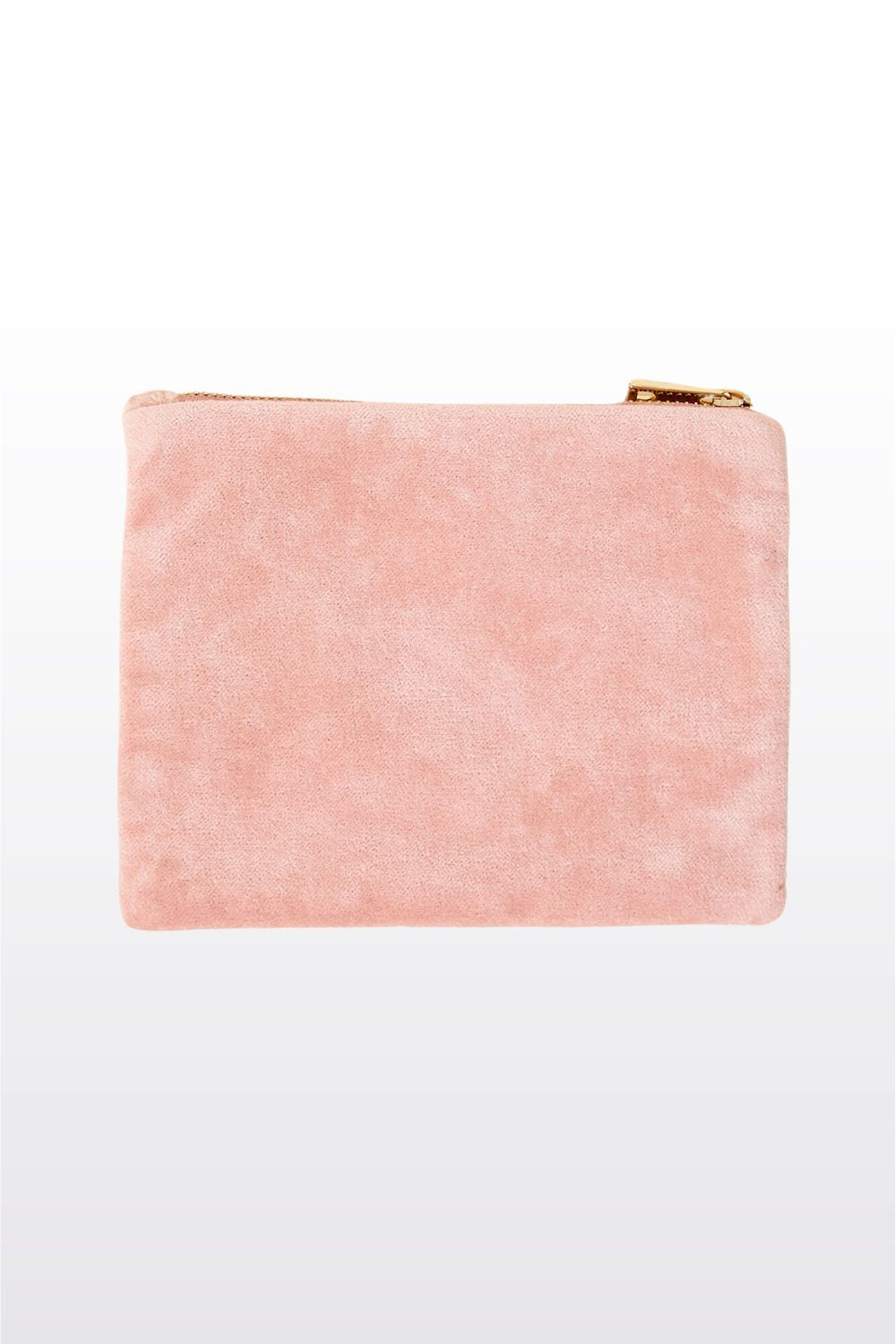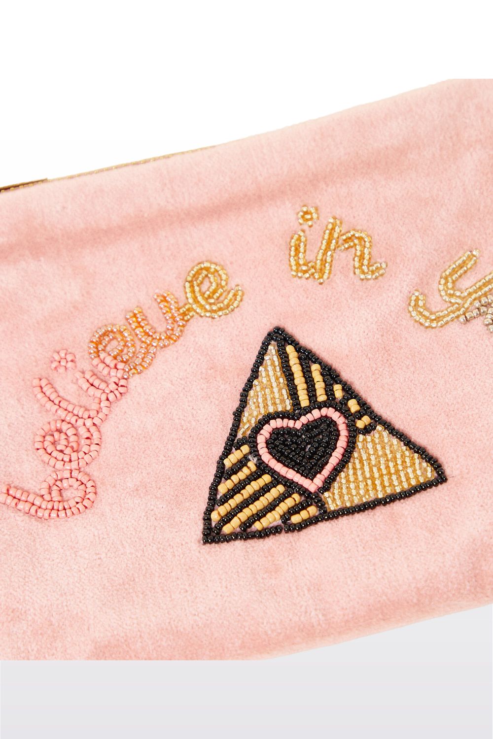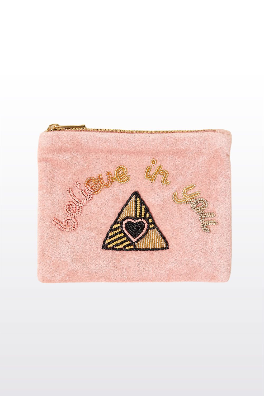 תיק איפור מבית המותג ETAM, עשוי בד פרוותי ורך בצבע ורוד, בעל תא אחסון אחד ועם רקמה BELIVE IN YOU.