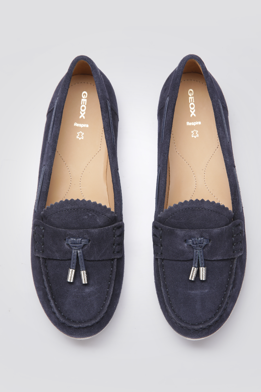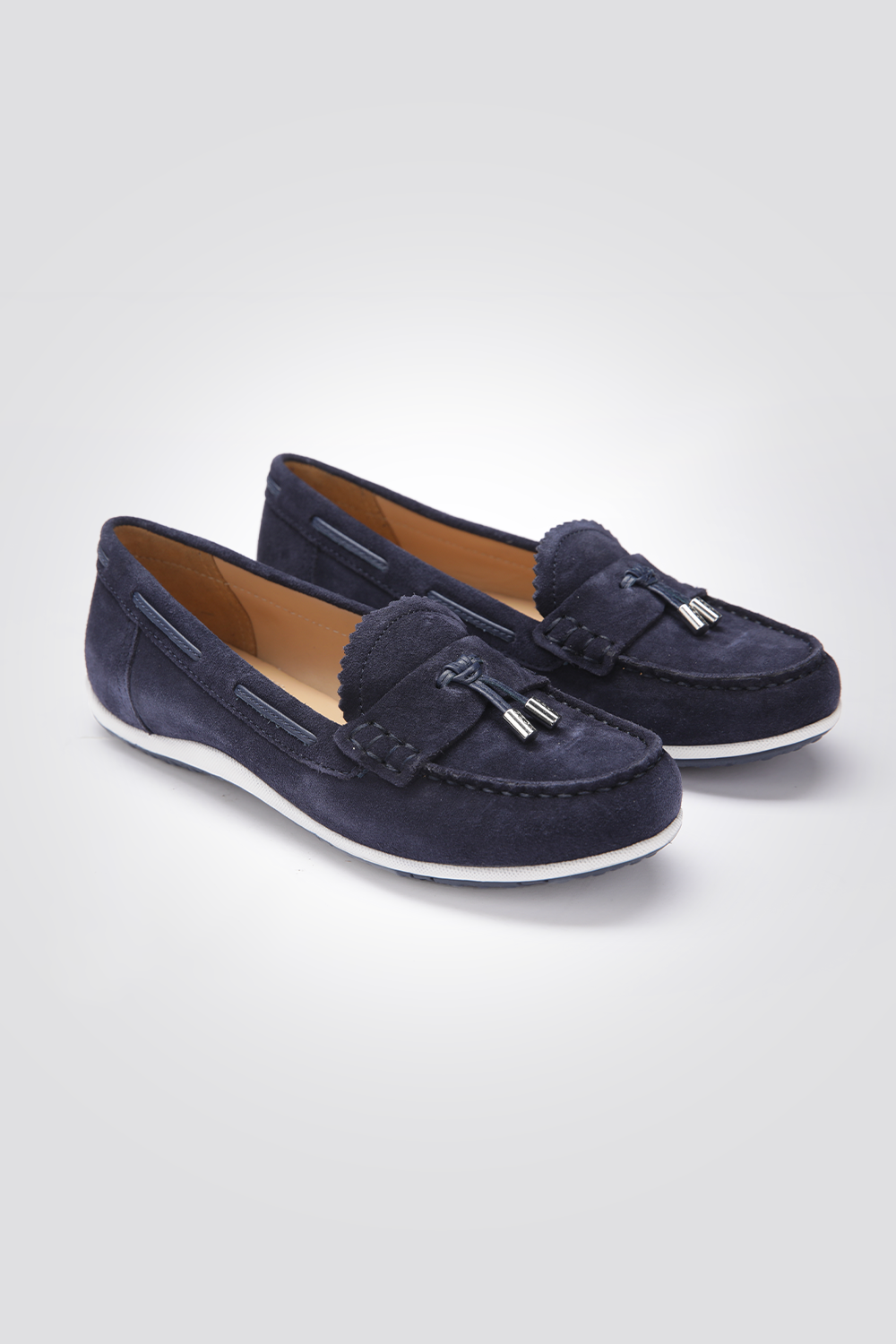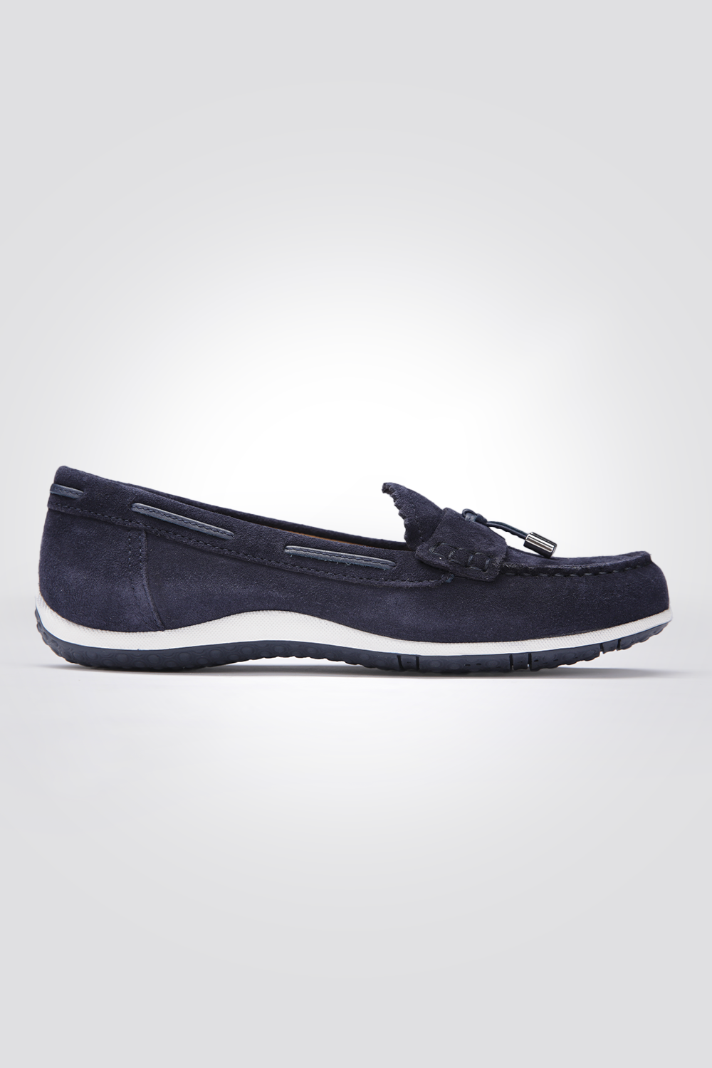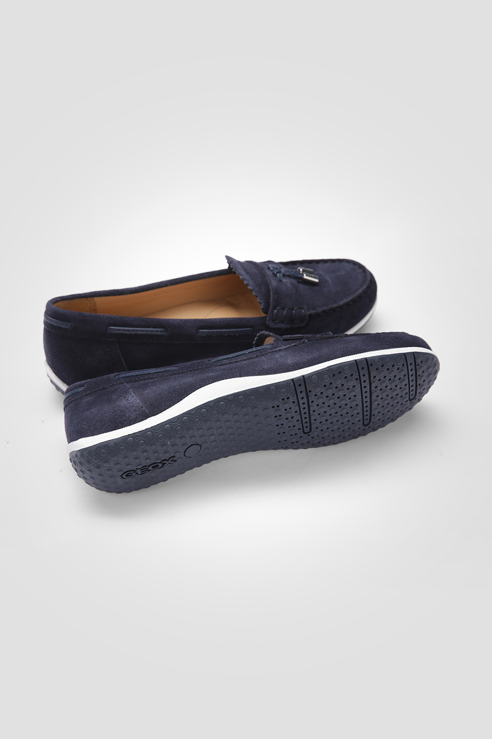 נעלי מוקסין לנשים מבית המותג GEOX בצבע נייבי, בעלות חרטום מעוגל, רצועה מעוטרת בקדמת הנעל וסוליה חיצונית שטוחה מגומי.
