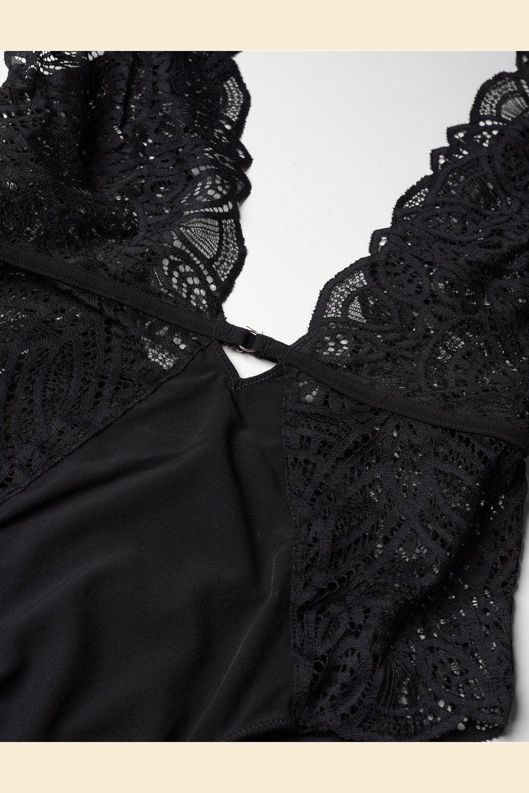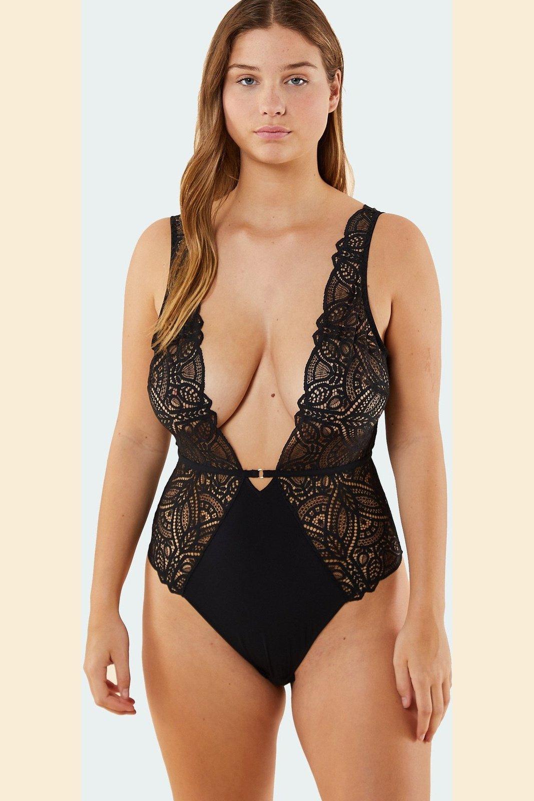 בגד גוף מבית המותג הצרפתי ETAM עשוי תחרה שקופה בדוגמה גרפית פרחונית, מחשוף וי עמוק, גב פתוח, חגורה דקיקה במותן וכתפיות רחבות, בשילוב בד מיקרופייבר גמיש ונוח בחלק התחתון.