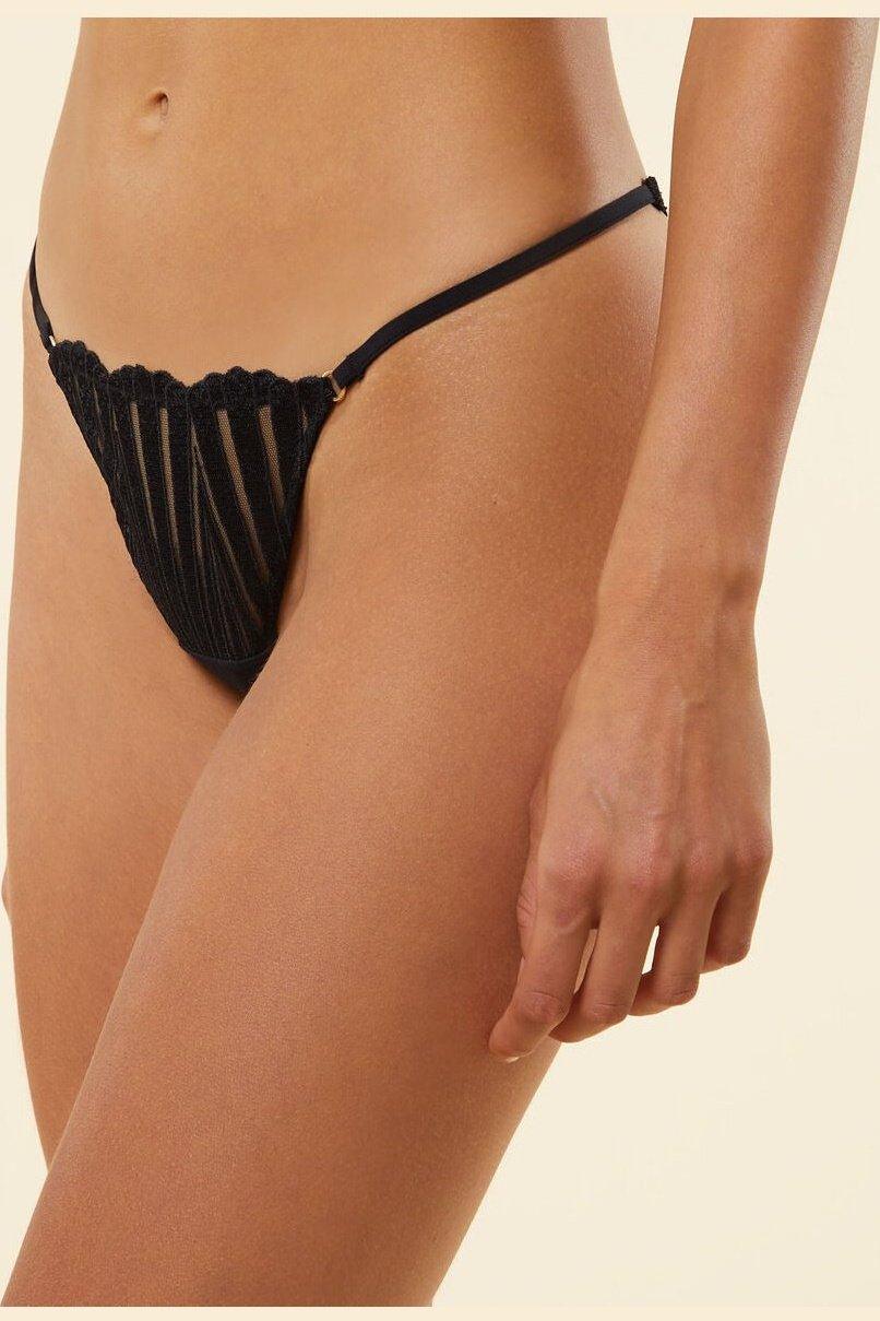 תחתוני חוטיני מבית המותג הצרפתי ETAM מבד רשת בדוגמת פסים רקומים היוצרים משחקי שקיפות. רצועות דקיקות בצידי התחתון מחוברות בעיטור מוזהב.
