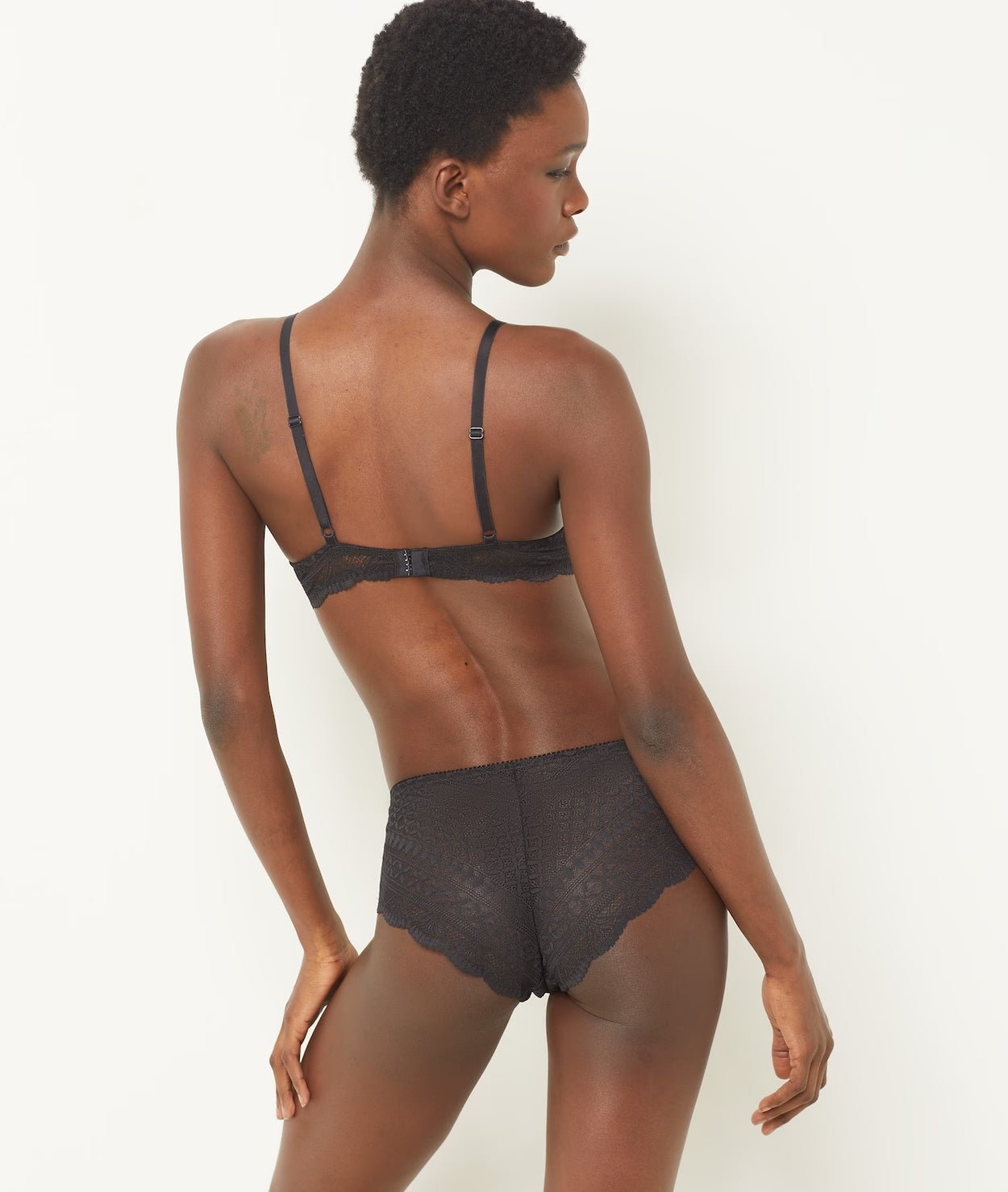 תחתונים בגזרת בוקסרון, מבית המותג הצרפתי ETAM, מקולקציית IDOLE האייקונית, עם שוליים רחבים וכיסוי מלא מאחור, עשויים תחרה עדינה בדוגמה גרפית ייחודית ואלגנטית, ובגימור גלי המשתלב עם גופך בשלמות.