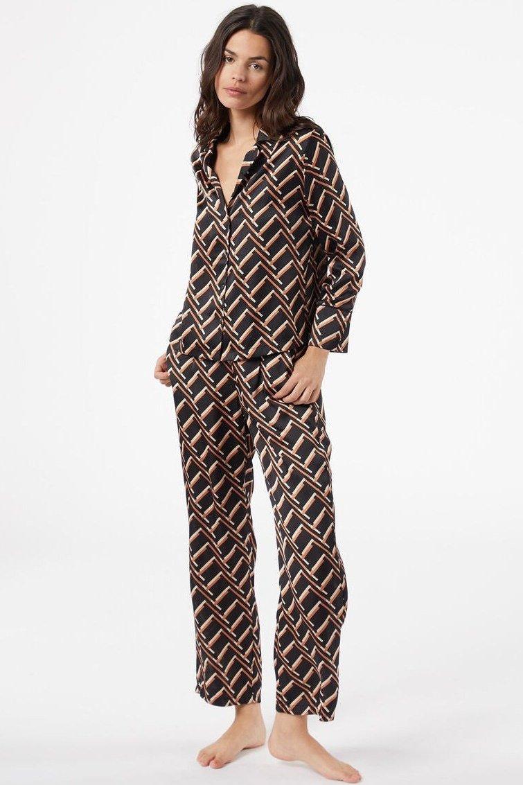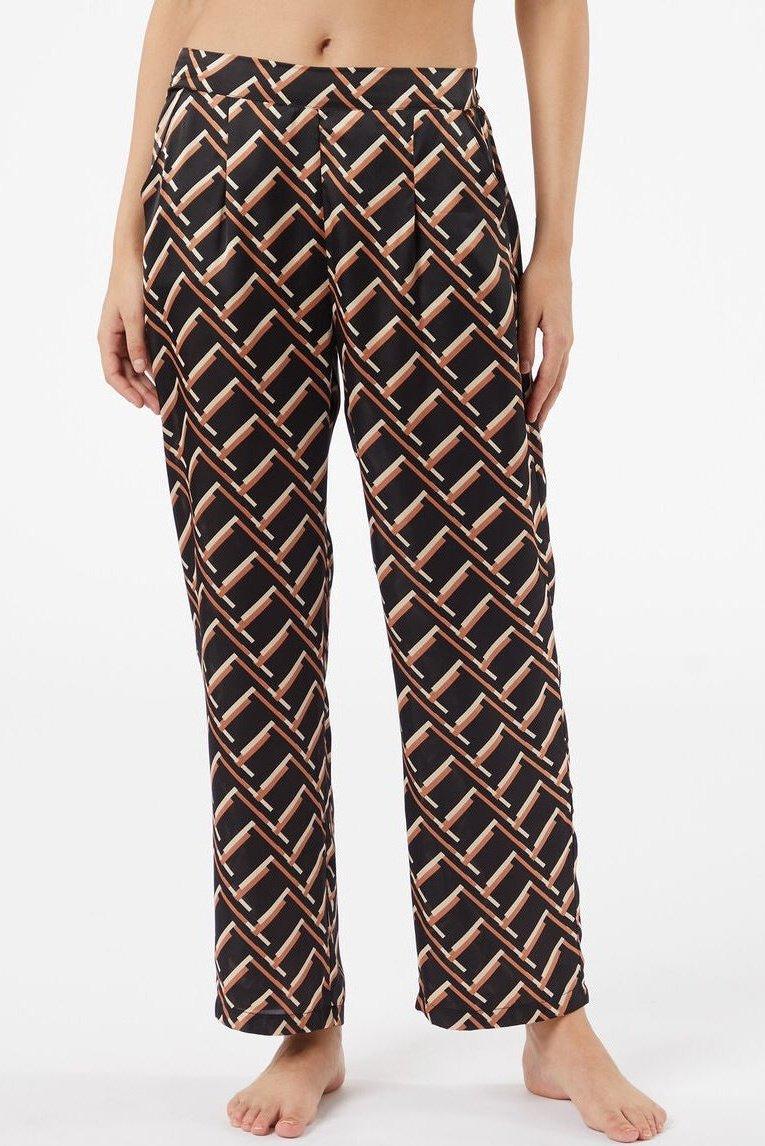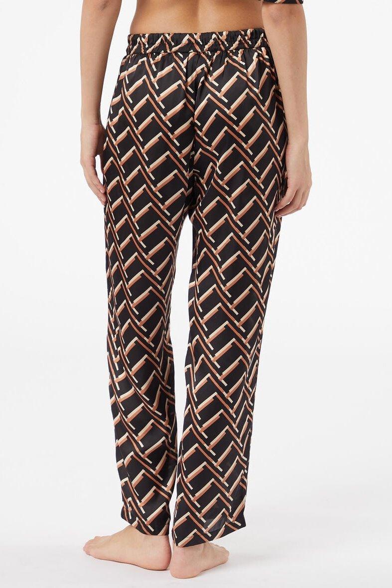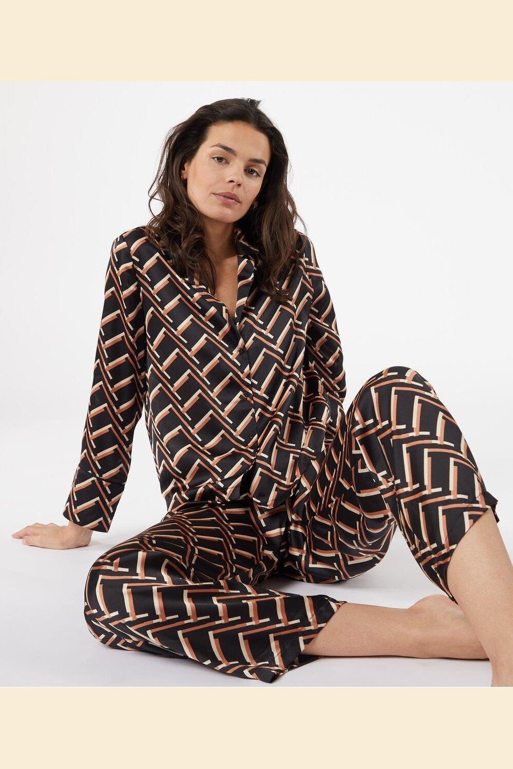 מכנסי פיג'מה ארוכים מבית המותג הצרפתי ETAM מבד סאטן נעים וקליל בהדפס גיאומטרי. גזרה ישרה ונינוחה, עם מותן אלסטית ושני כיסים צידיים.