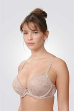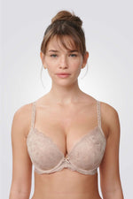 חזיית דאבל פוש-אפ בעלת ריפוד ייחודי היוצר מראה גדול יותר בשתי מידות! החזיית מעוטרת ברקמה רומנטית ומעודנת ובאבזם יהלומים מרובע.