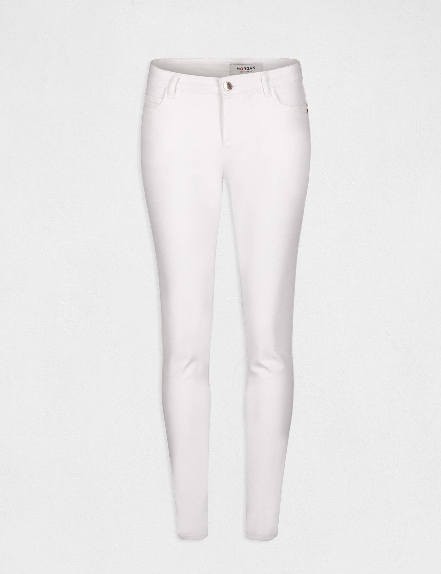 מכנסי ג'ינס סקיני בצבע קרם בגזרה צרה של המותג הצרפתי MORGAN, סגירת רוכסן וכפתור ,למכנס 2 כיסים מקדימה ועוד 2 כיסים מאחור, לולאות חגורה במותניים.