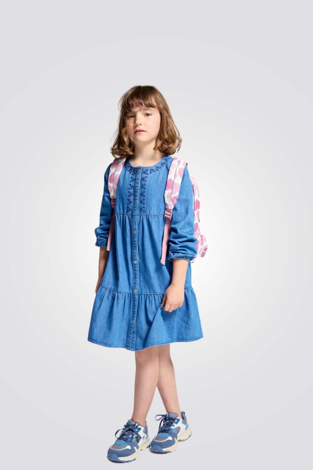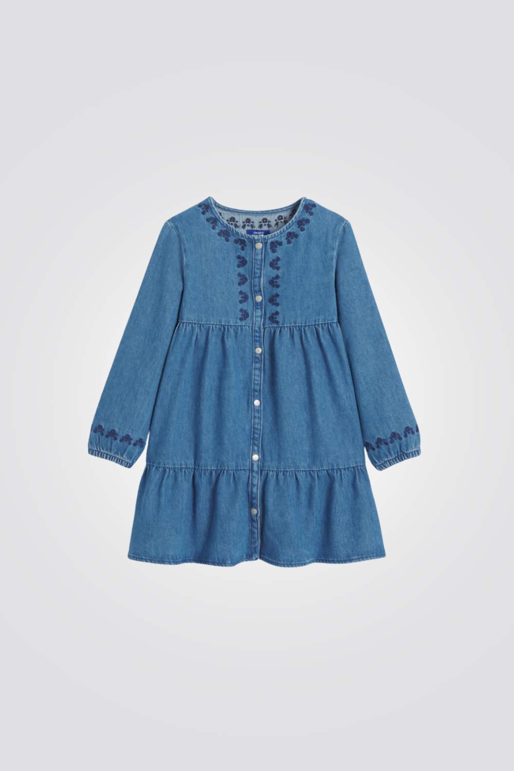 שמלת ג'ינס לילדות מבית המותג OKAIDI, עם שרוולים ארוכים וצווארון עגול, בגזרה רחבה עם עיטורי רקמה .