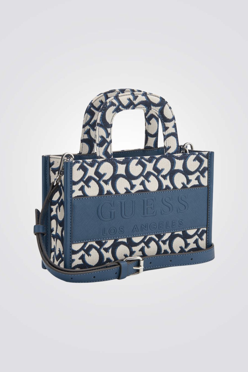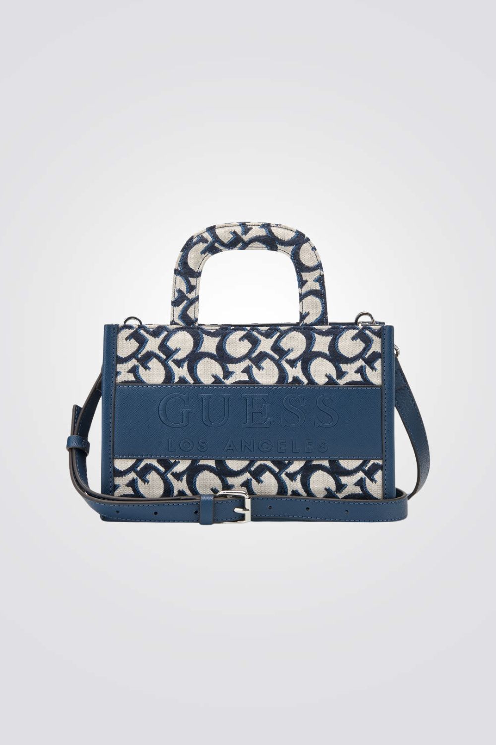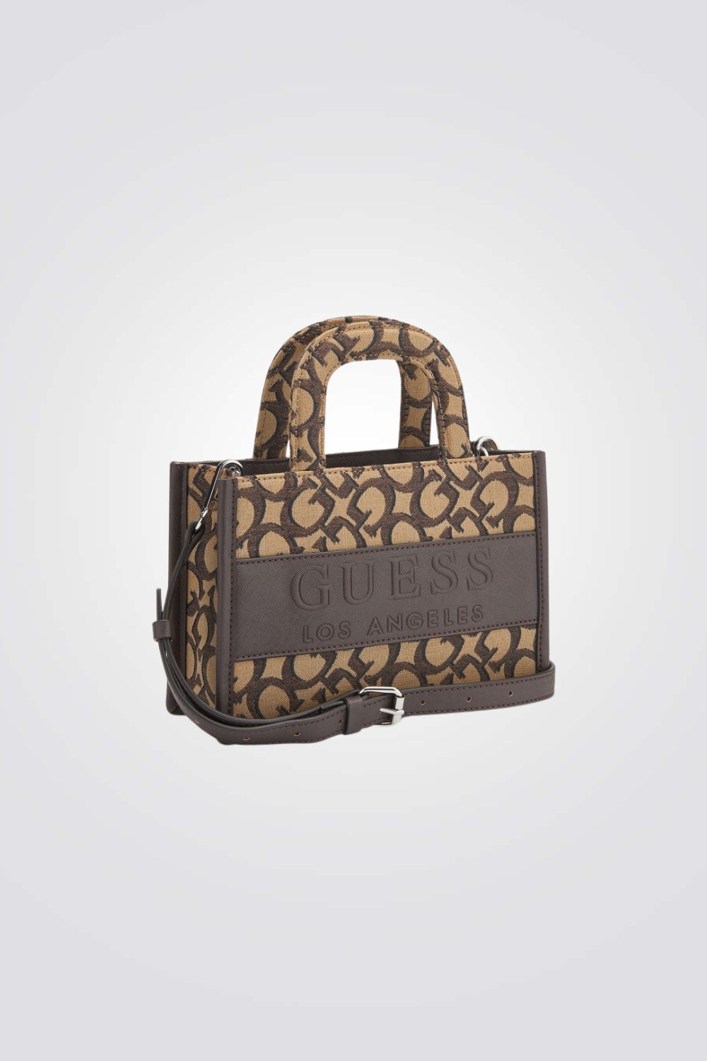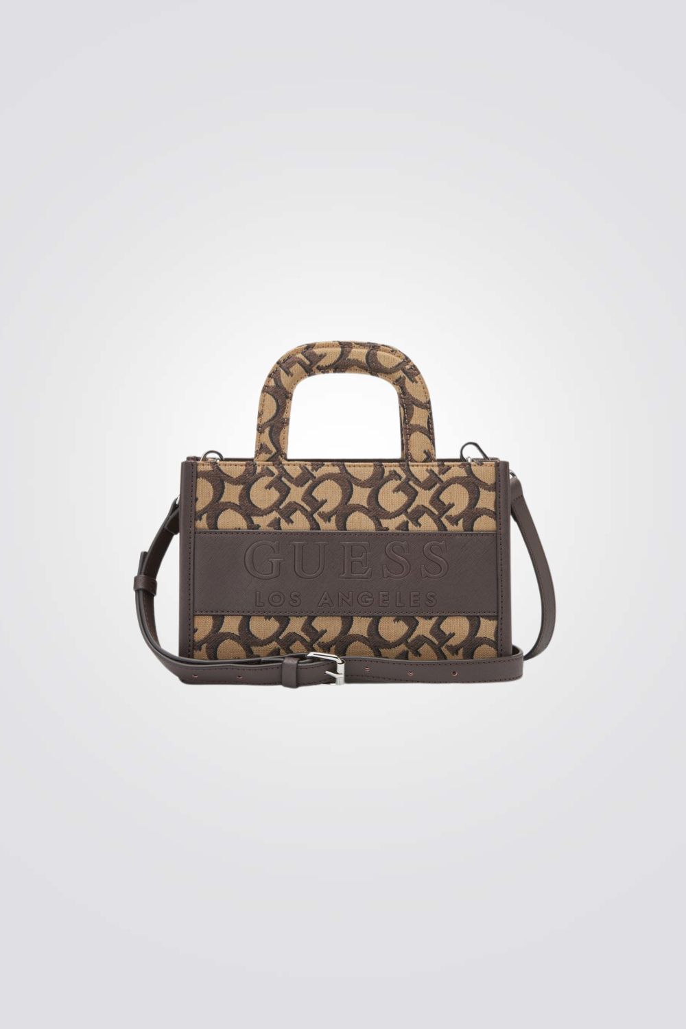 תיק צד קטן מבית המותג GUESS עם הדפס, בעל רצועות נשיאה רחבות וקצרות, רצועת כתף מתכווננת הניתנת להסרה, תא אחסון מרכזי עם סגירת תיק-תק בשילוב כיסים פנימיים ולוגו המותג בחזית.