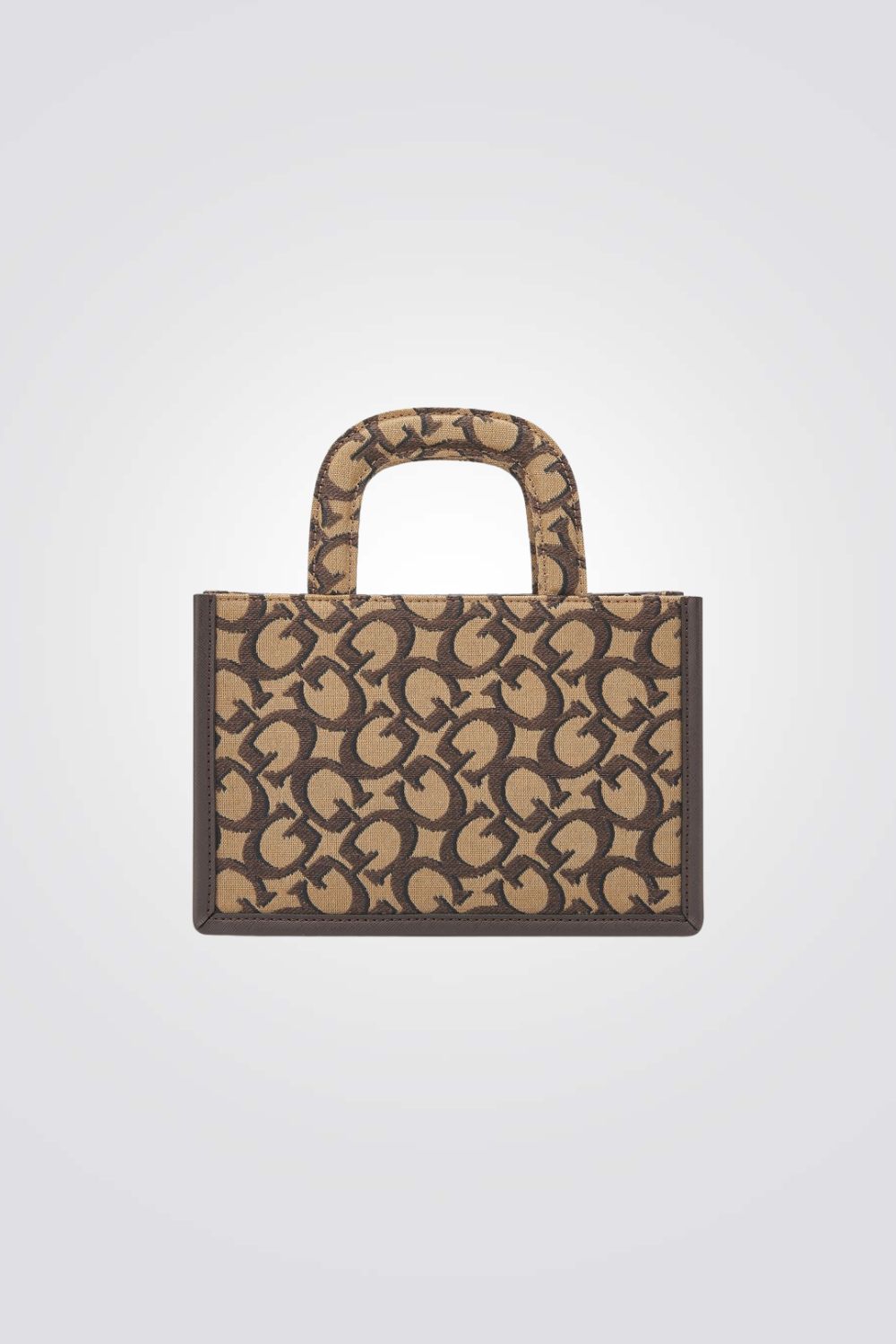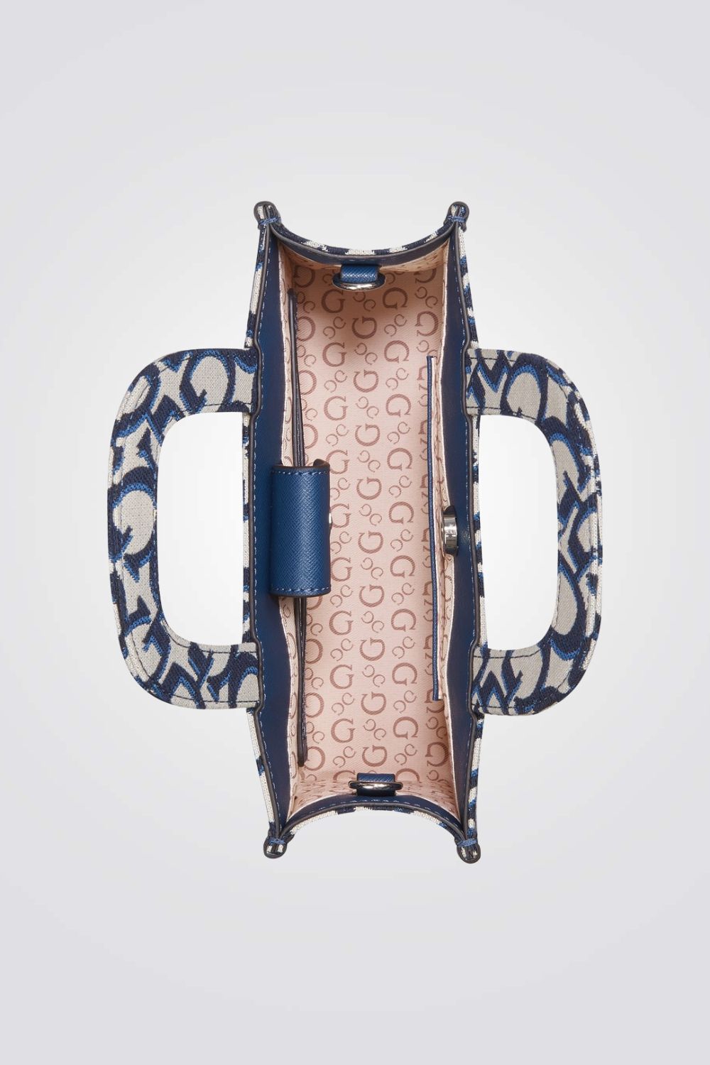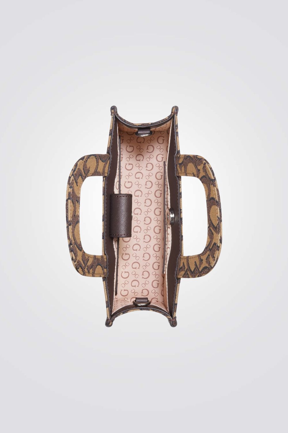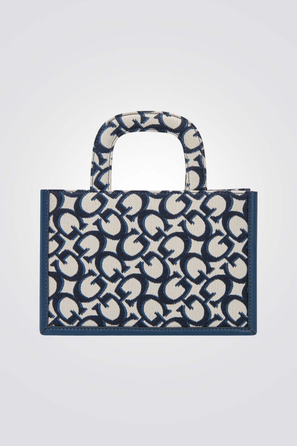 תיק צד קטן מבית המותג GUESS עם הדפס, בעל רצועות נשיאה רחבות וקצרות, רצועת כתף מתכווננת הניתנת להסרה, תא אחסון מרכזי עם סגירת תיק-תק בשילוב כיסים פנימיים ולוגו המותג בחזית.