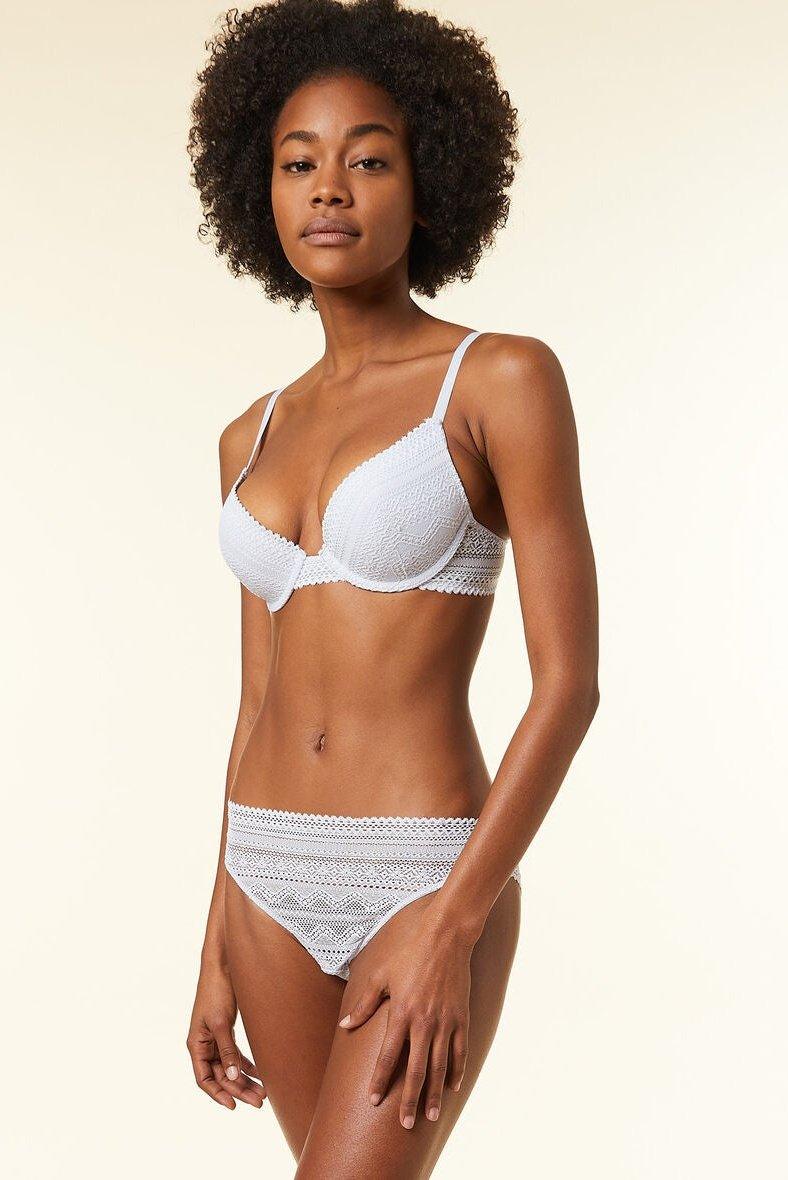 חזיית פוש אפ מבית המותג הצרפתי ETAM עם קאפים מרופדים במחשוף עמוק, מעוטרים תחרה בדוגמה גרפית, המעניקים מראה מורם ומעוצב ואפקט פוש אפ עד מידה אחת יותר. ברזלים לתמיכה, כתפיות מתכווננות וסגירת קרסים אחורית.