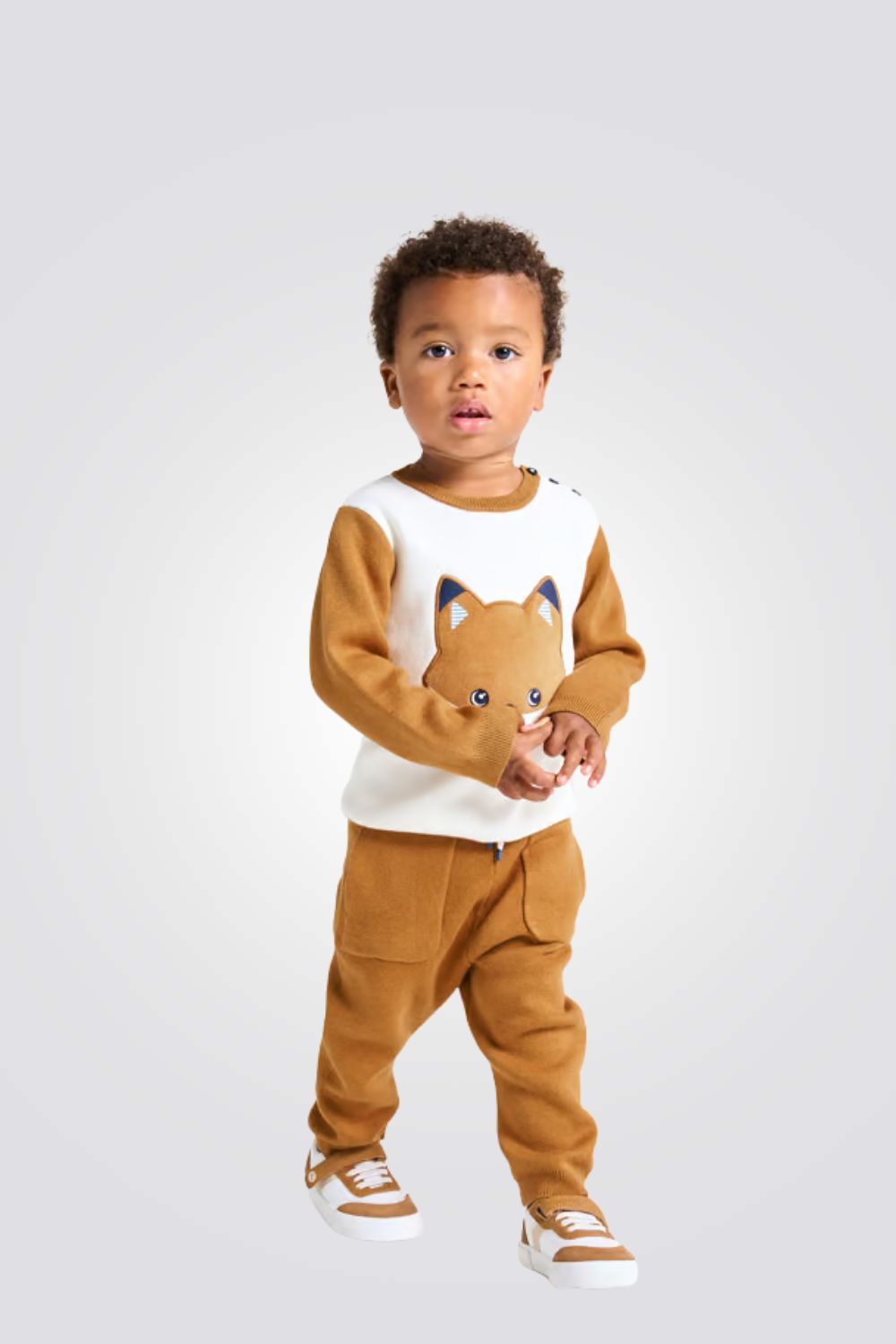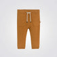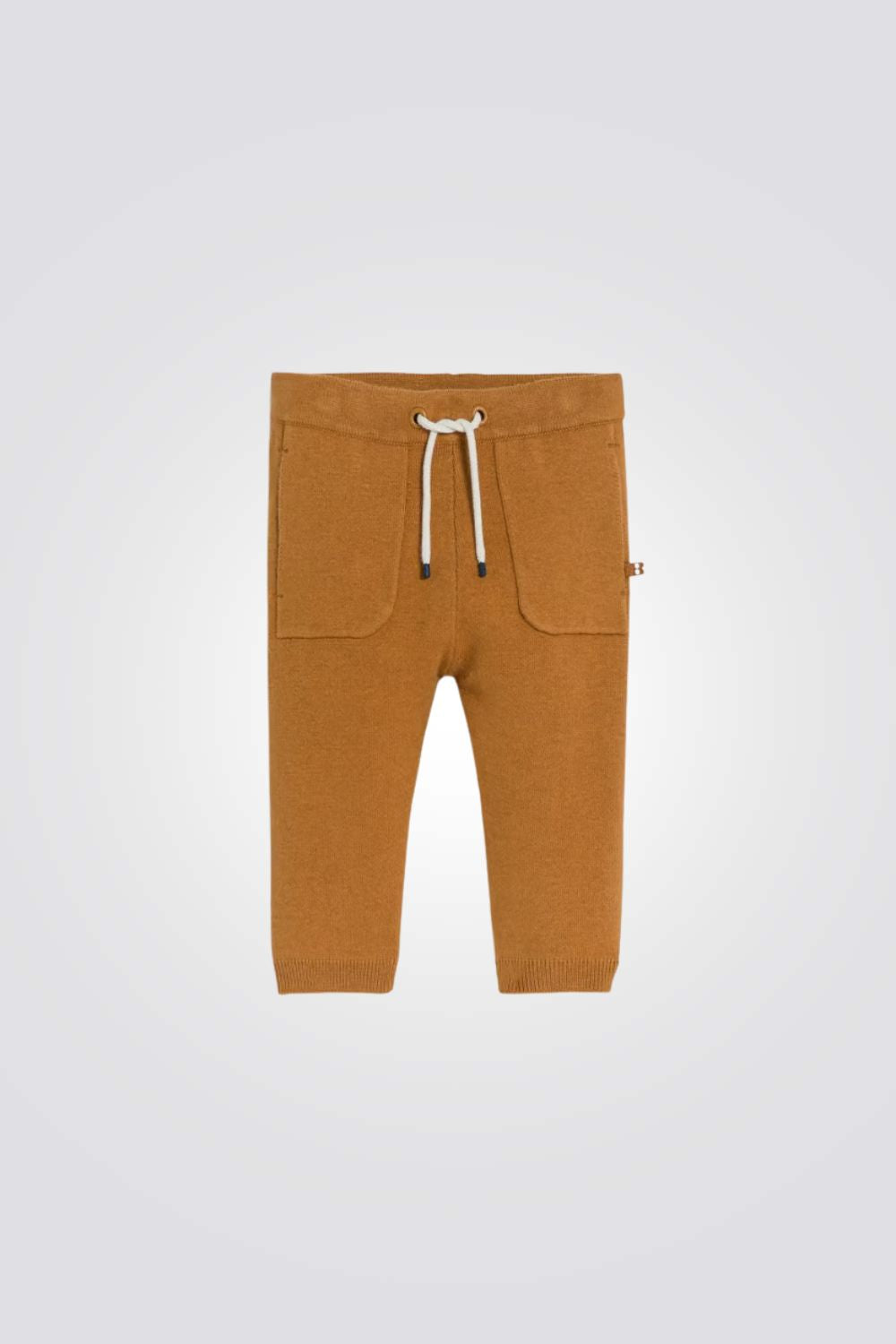 מכנסיים לתינוקות מבית המותג OBAIBI, בצבע חום, עשויות מבד סריג רך וגמיש, מותן גומי עם שרוכי קשירה .