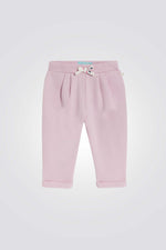 מכנסי טרנינג לתינוקות מבית המותג OBAIBI, בצבע ורוד בהיר, עשויים מבד נינוח ורך, עם מותן אלסטית, וסיומת תפורה עם קפלים ברגליים.