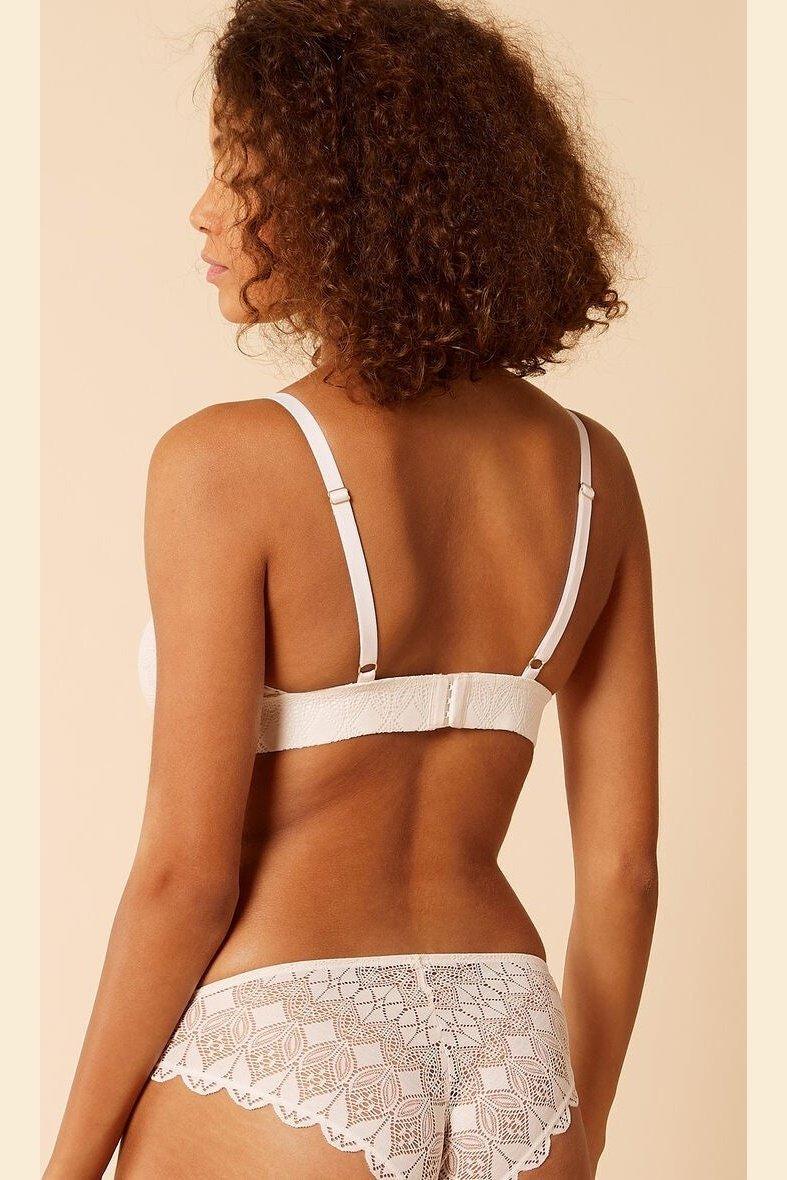 חזייה מבית המותג ETAM עשוייה תחרה בדוגמה גרפית. קאפים בעיצוב משולשים ללא ריפוד וללא ברזל, עם רצועה אלסטית רחבה לתמיכה מתחת לחזה, כתפיות מתכווננות וסגירת קרסים אחורית.