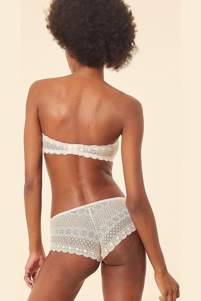 טופ סטרפלס מבית המותג הצרפתי ETAM מתחרה עדינה בדוגמה גרפית, קו מחשוף ישר, ללא ברזלים וללא ריפוד, רצועה אלסטית לתמיכה מתחת לחזה וסגירת קרסים אחורית.