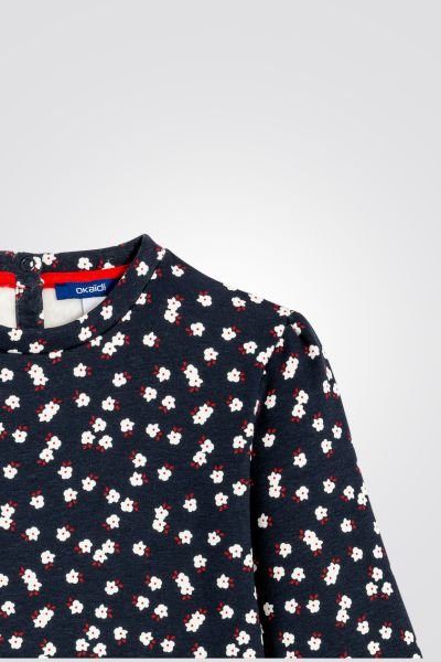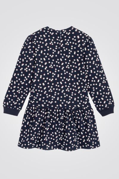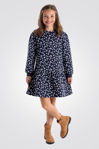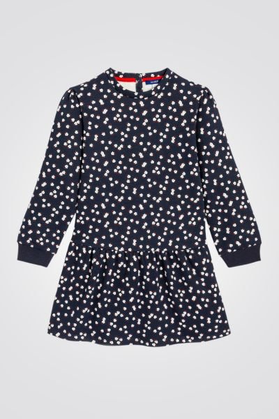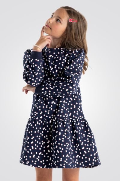 שמלת ילדות שרוול ארוך הדפס פרחים לבנים על כחול