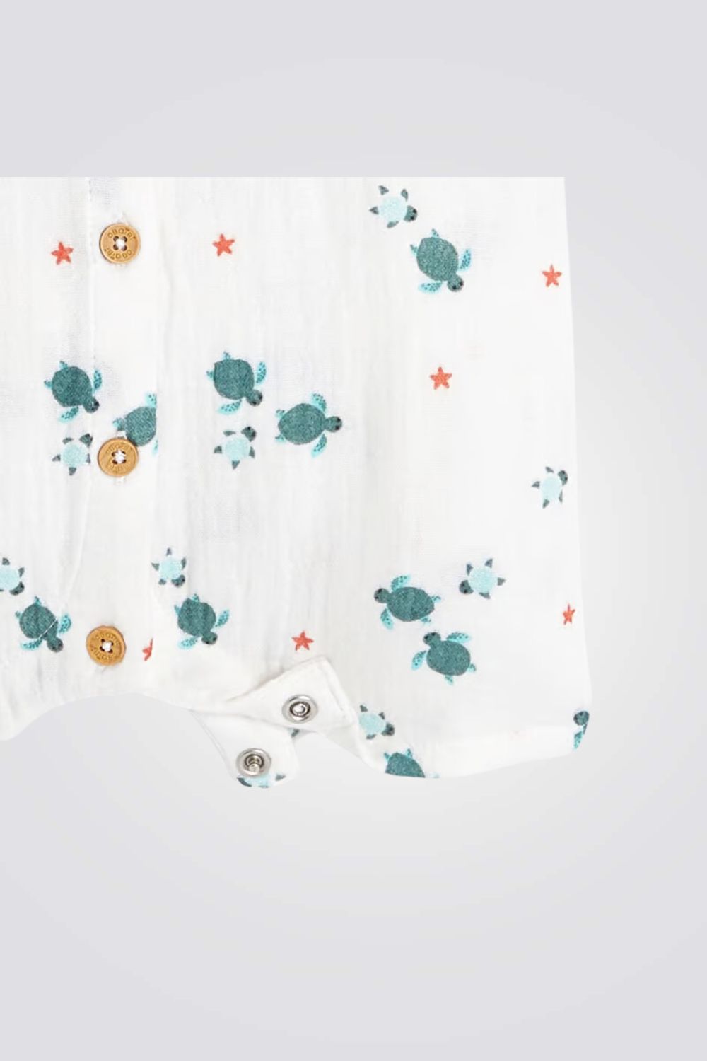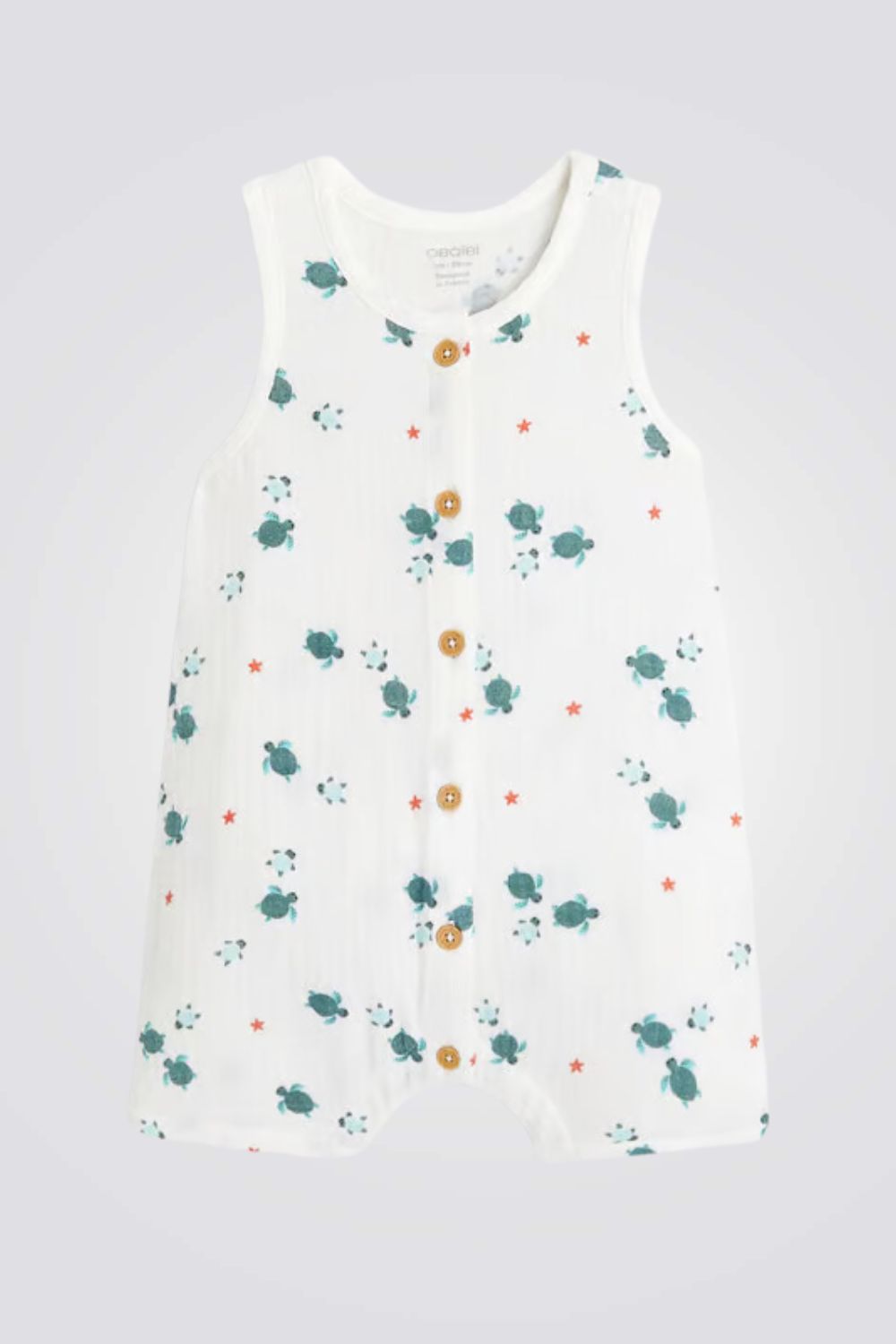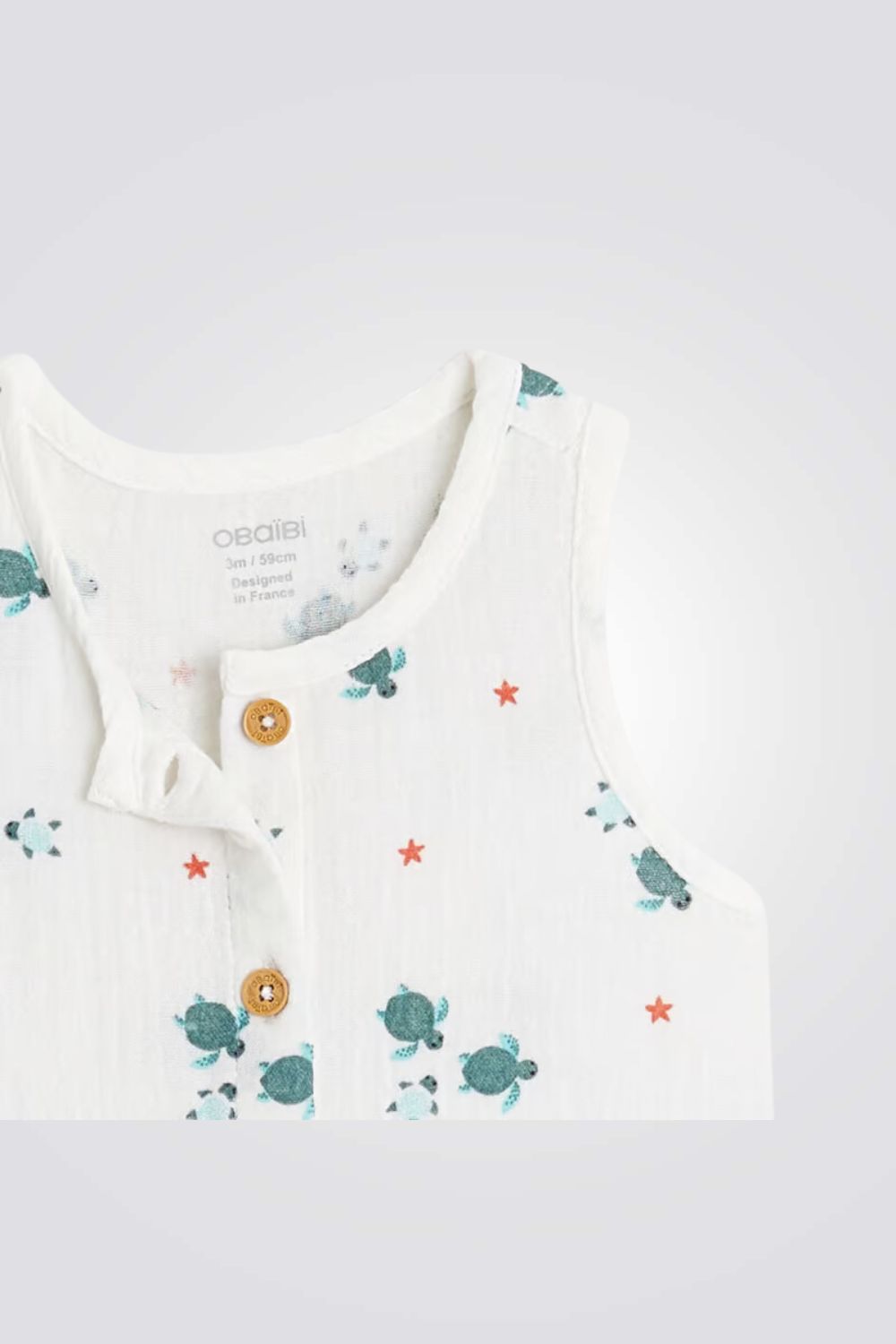 אוברול ללא שרוולים לתינוקות מבית המותג OBAIBI, עשוי מבד כותנה נעים המתאים לתינוקות מיום הלידה, בצבע לבן עם הדפסים קטנים של צבים וסגירת כפתורים קדמית.