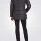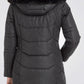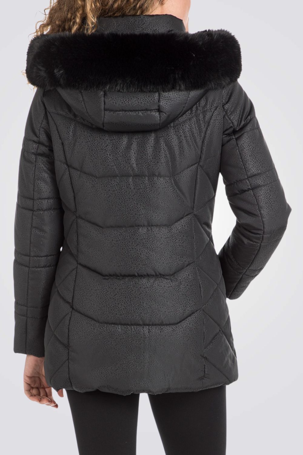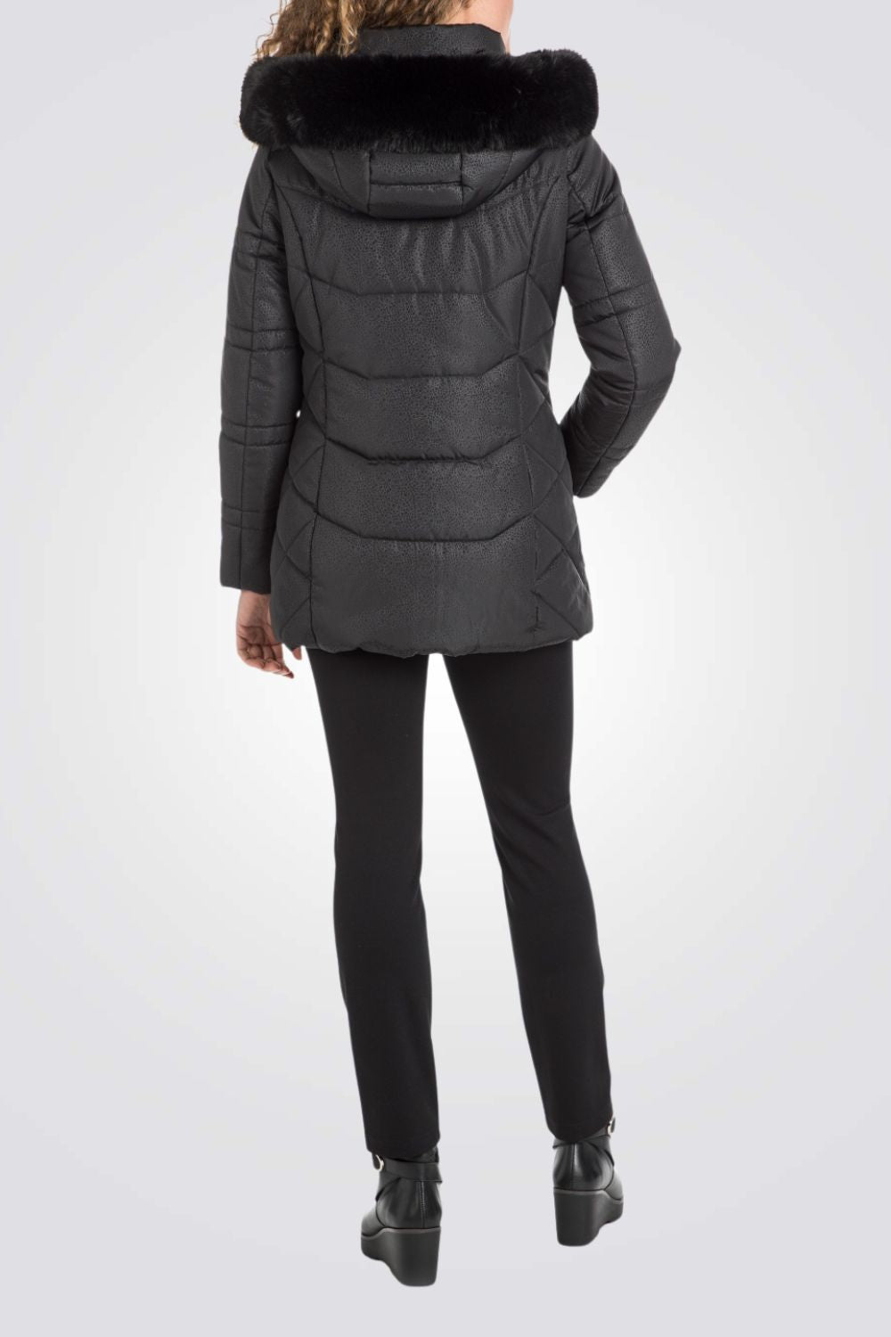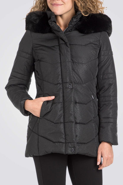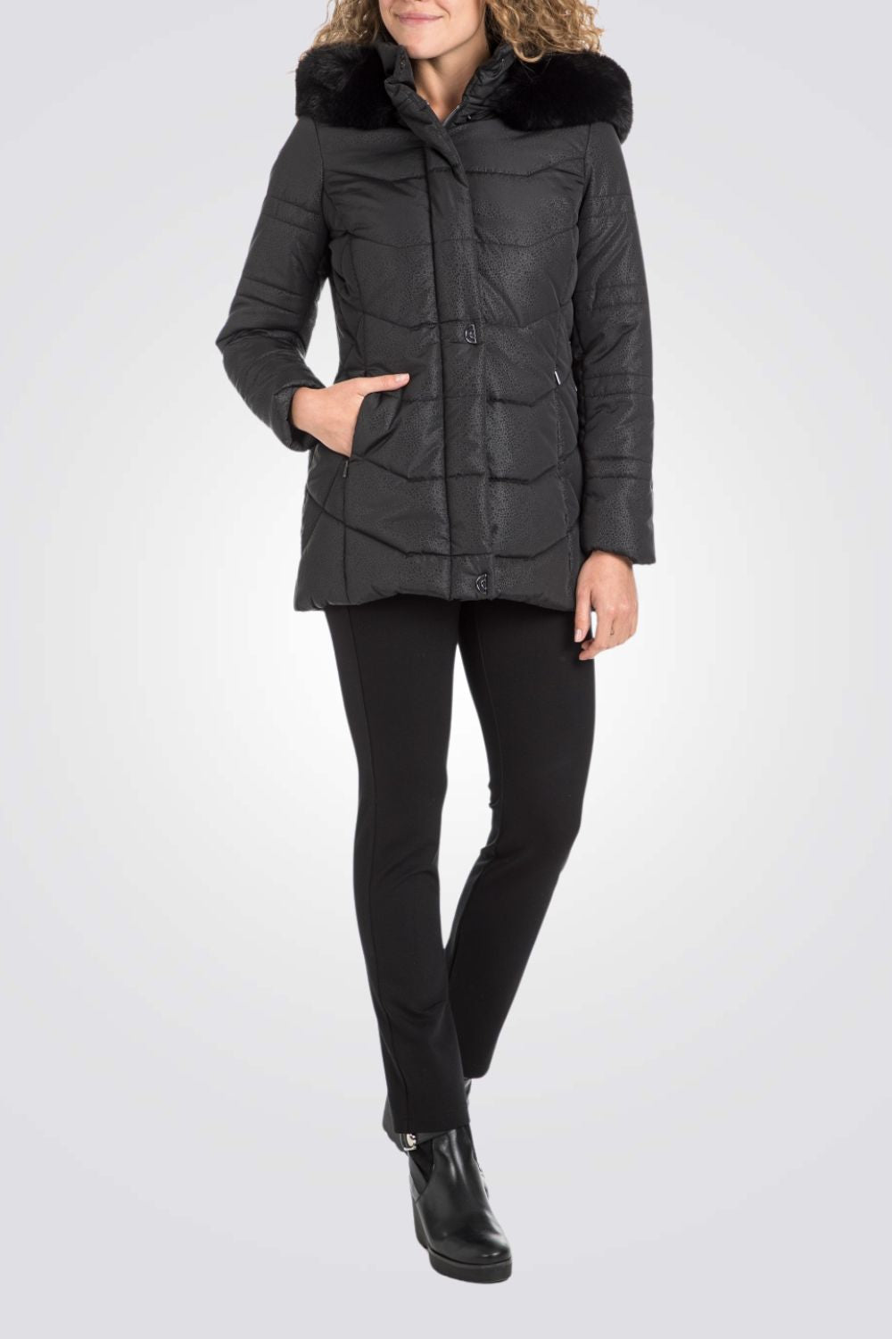 מעיל מרופד לנשים מבית המותג PUNT ROMA עם הדפס נקודות בצבע שחור, בעל שרוולים ארוכים, צווארון גבוה בשילוב כובע קפוצ'ון פרוותי נשלף, 2 כיסים קדמיים וסגירת רוכסן בשילוב כפתורים.