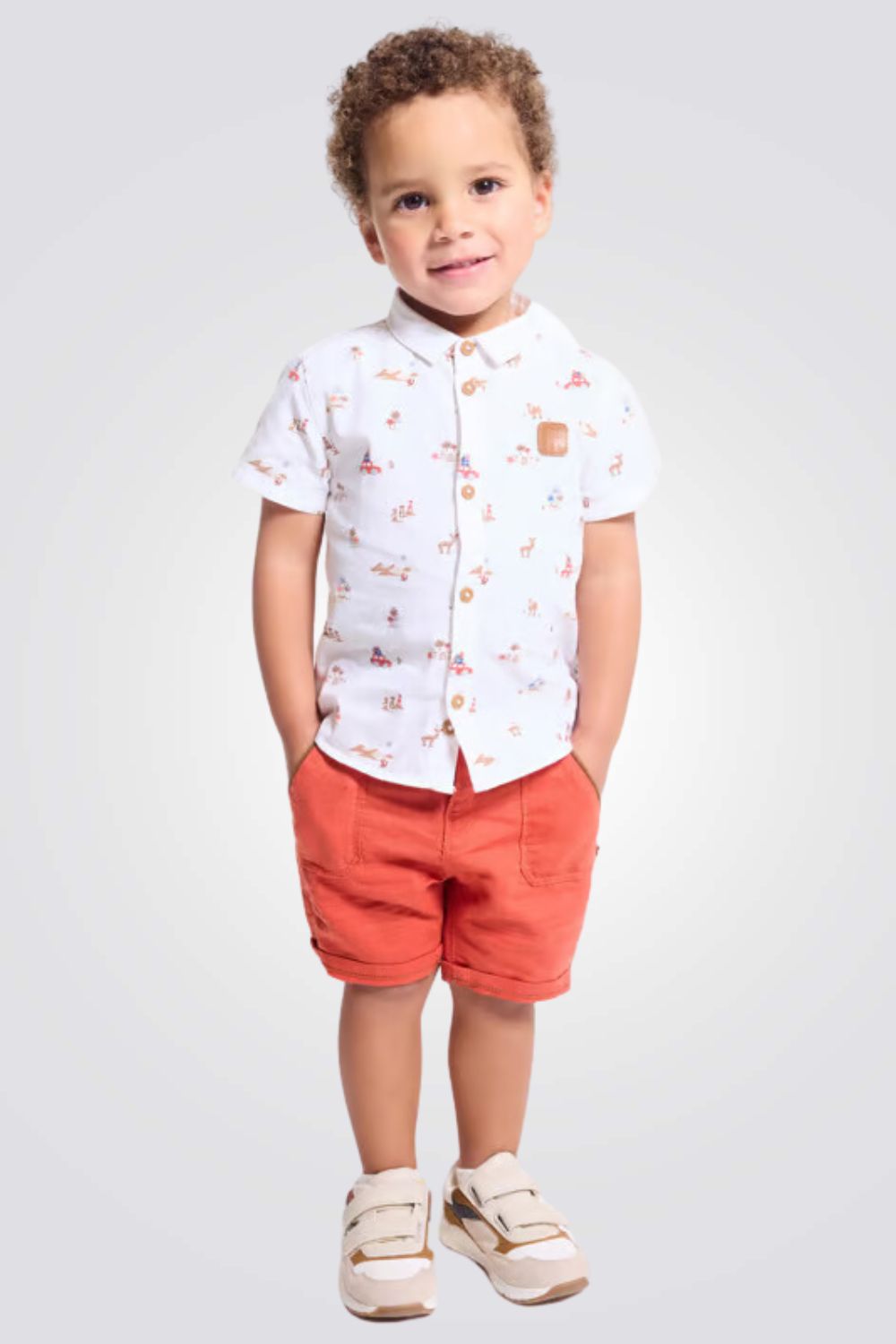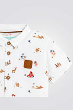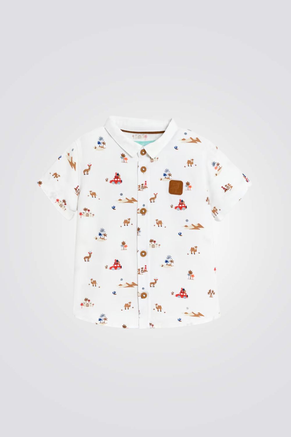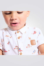 מכופתרת לתינוק מבית המותג OBAIBI בצב לבן עם הדפסים מתוקים של איילים ומכוניות, בעלת כפתורים חומים, שרוול קצר וצאוורון דש.