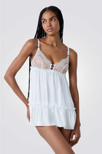 כותונת לילה קצרה מבית המותג ETAM העשויה בחלקה התחתון בד סאטן רך ונעים ובחלקה העליון תחרה שקפקפה עם עיטרוים פרחונים, רצועות מתכווננות ודקיקות עם טבעות זהובות קטנות דקורטיביות במרכז החדה.