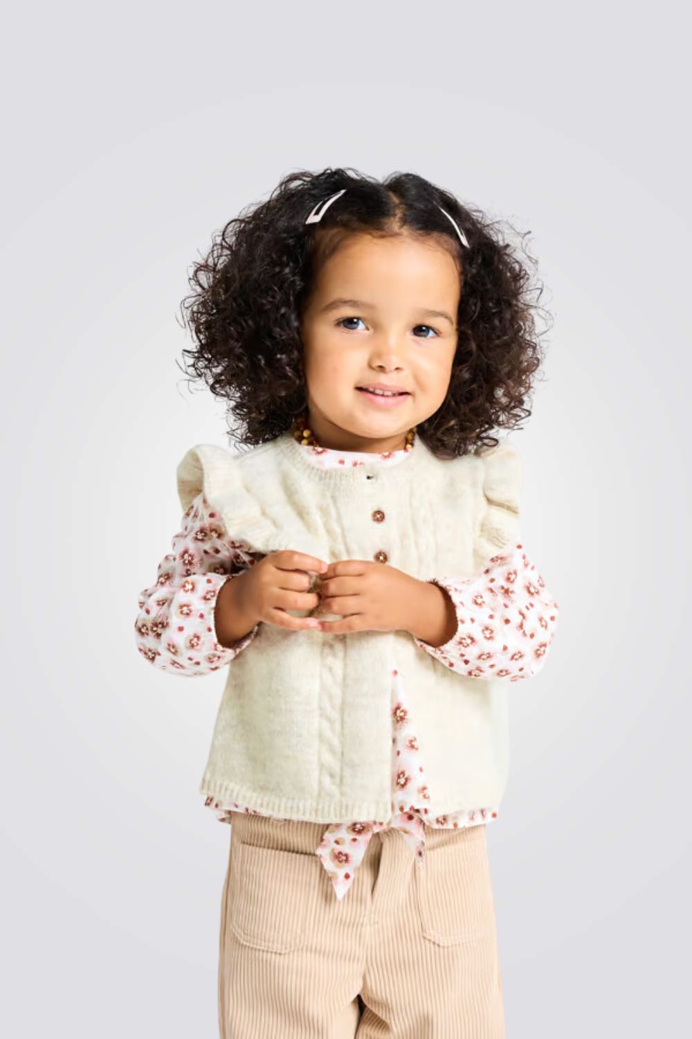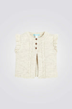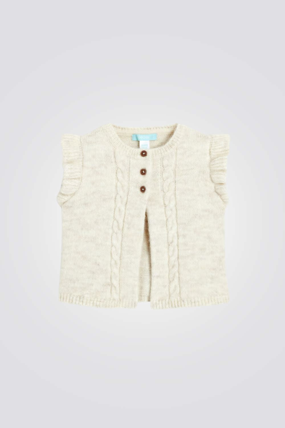 סריג ווסט לתינוקות מבית המותג OBAIBI, בצבע בז', ללא שרוולים עם מלמלות קטנות , עם סגירת שלושה כפתורים.