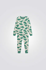 פיג'מה לילדים מבית המותג OKAIDI, מחממת ,נעימה ונוחה ,חולצה ארוכה עם צווארון עגול, ומכנסיים ארוכים עם גומי בסיומת, הדפס דינוזאורים בצבע ירוק.