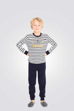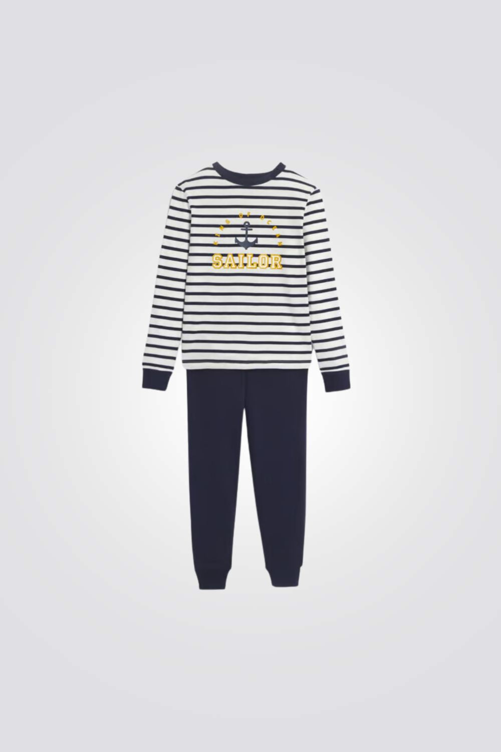 פיג'מה לילדים מבית המותג OKAIDI, בצבע כחול נייבי ,נוחה ונעימה ,חולצה עם פסים והדפס ומכנסיים עפ גומי בסיומת.