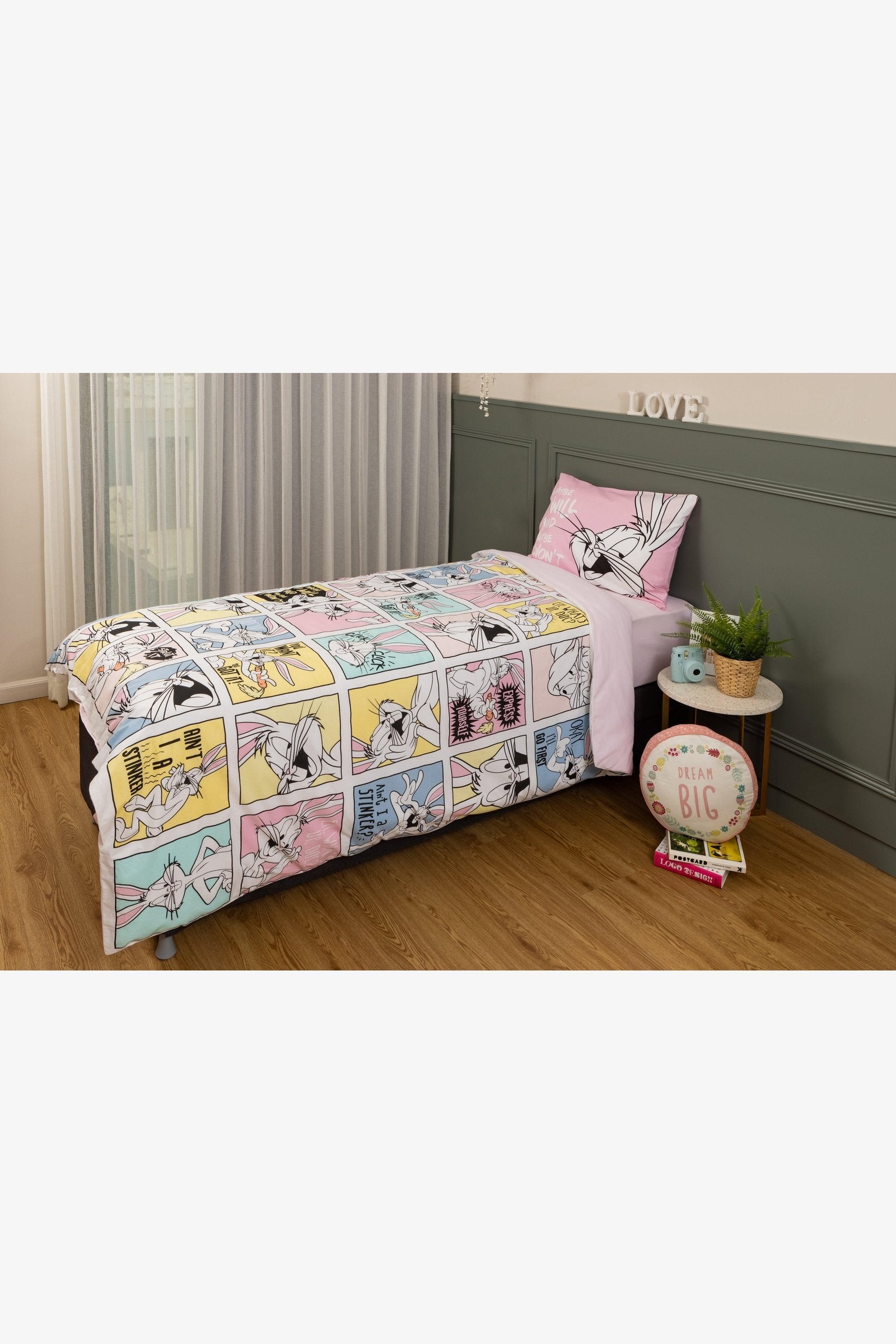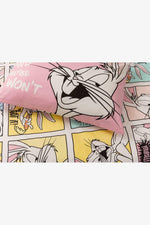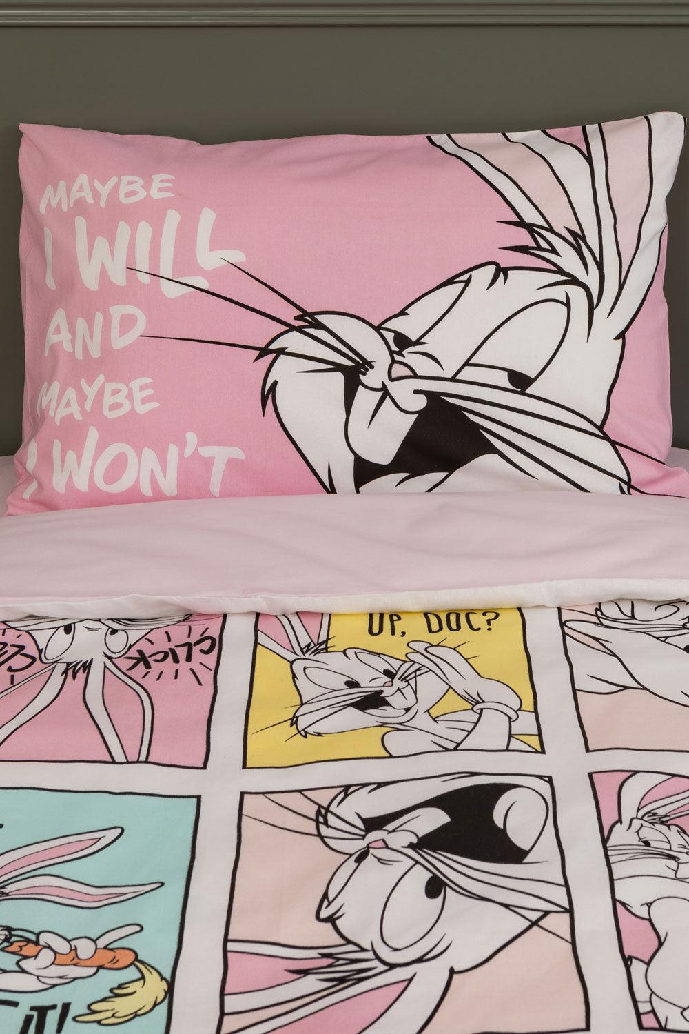 סט מצעים לילדים בכיכובן של דמויות ילדים אהובות. סט מצעים עם דוגמת הדמות באגס באני מהסדרה לוני טוס . מצעים בגוון ורוד בהיר עם איורים גדולים של הדמות על הציפה לשמיכה ועל הציפית לכרית. צד השני של הציפה בצבע אחיד ורוד בהיר. 100% כותנה,מידות הסט: ציפה 200*150, סדין גומי 90*200, ציפית 50*70