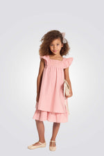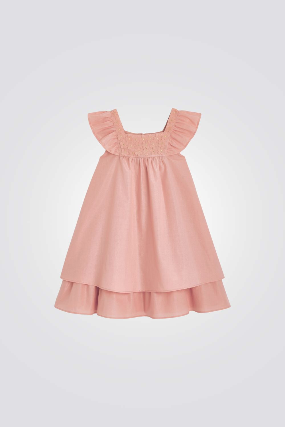 שמלה לילדות מבית המותג OKAIDI, בצבע ורוד באפקט סאטן , עם שרוולי מלמלה קצרים , בגזרה מתרחבת עם סגירת רוכסן מאחורה.