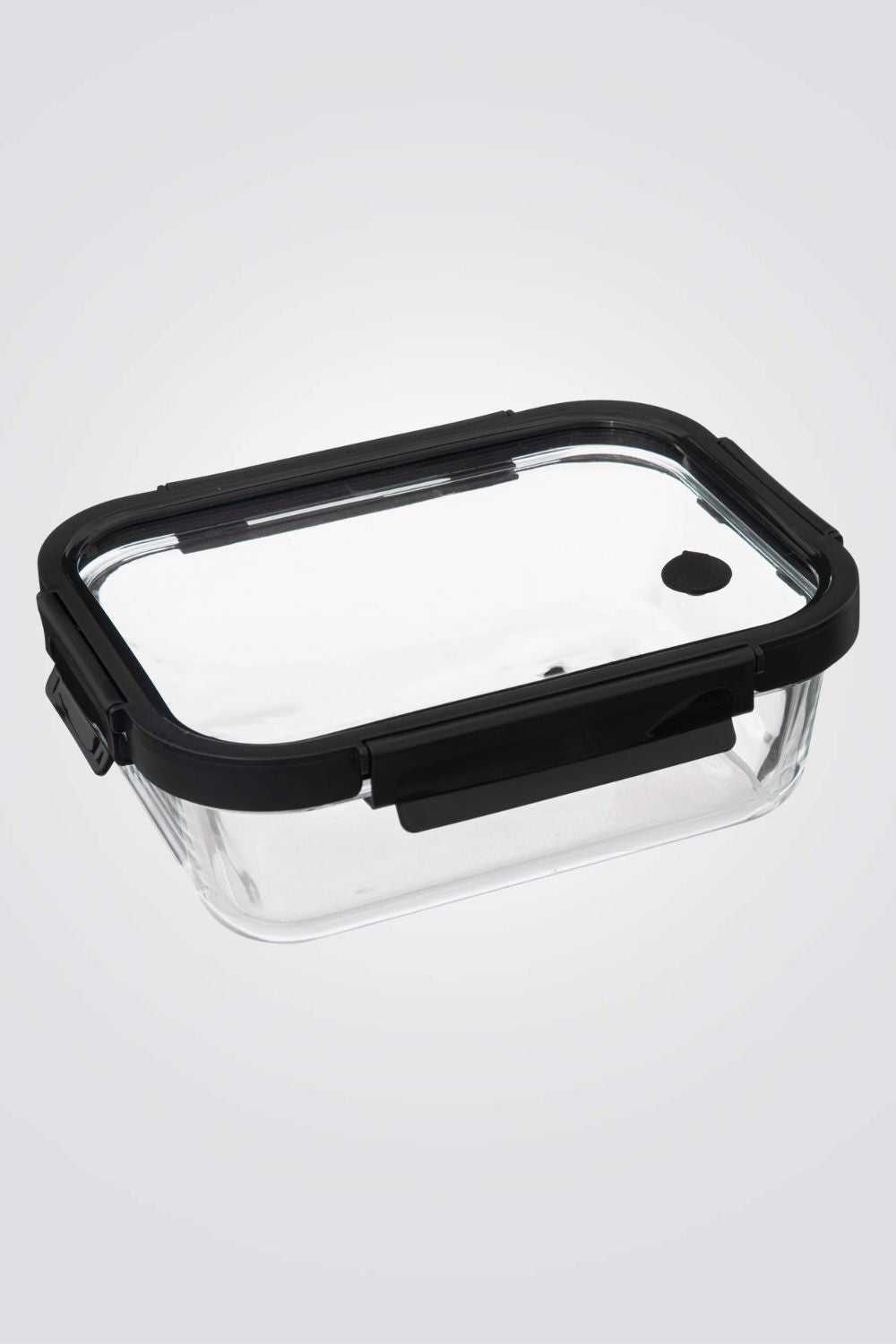 קופסת אחסון מלבנית מזכוכית, בעלת מכסה עם 4 קליפסים ומסגרת שחורה לאיטום מפני נוזלים.