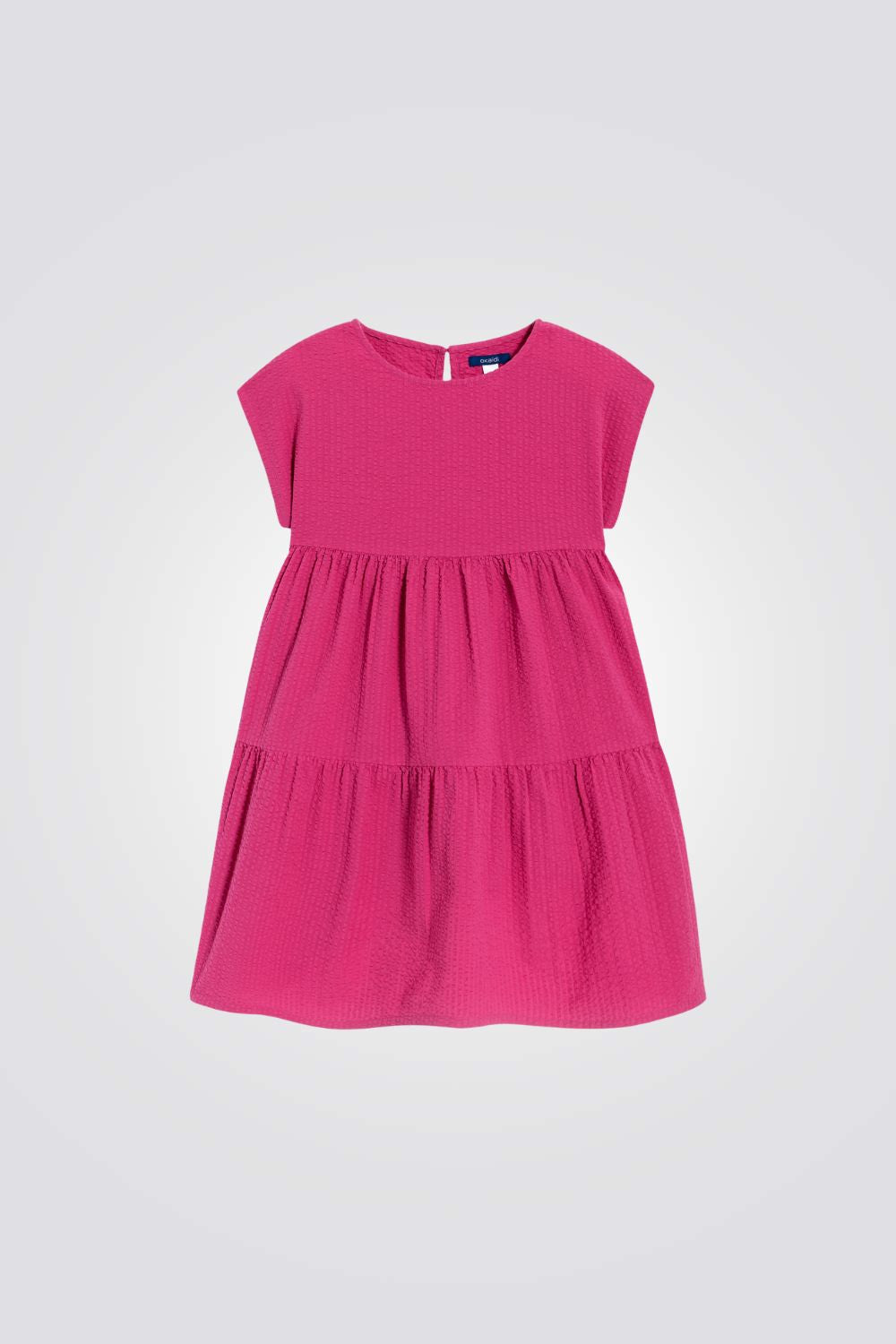 שמלה לילדות מבית המותג OKAIDI , בצבע ורוד עם צווארון עגול , שרוולים קצרים ומלמלה .