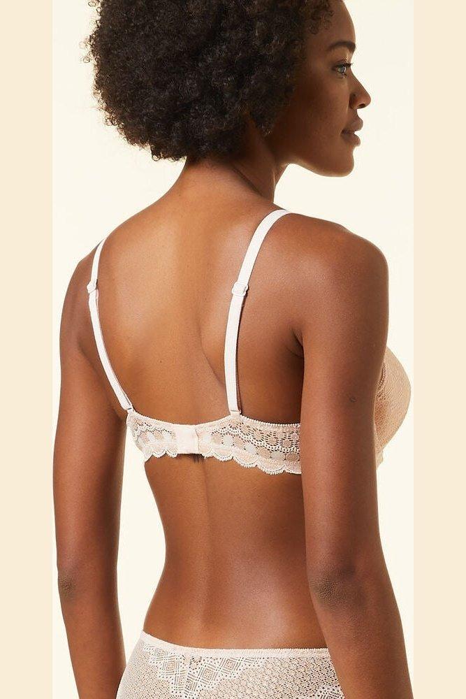 חזיית תחרה בדוגמה גרפית מבית המותג ETAM עם קאפים מרופדים המעניקים מראה מעוצב ואפקט פוש אפ עד מידה אחת יותר, כתפיות מתכווננות וסגירת קרסים אחורית.