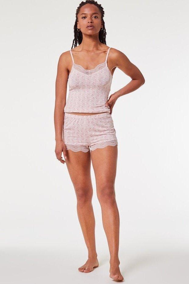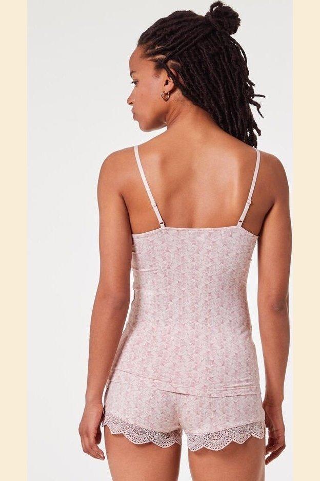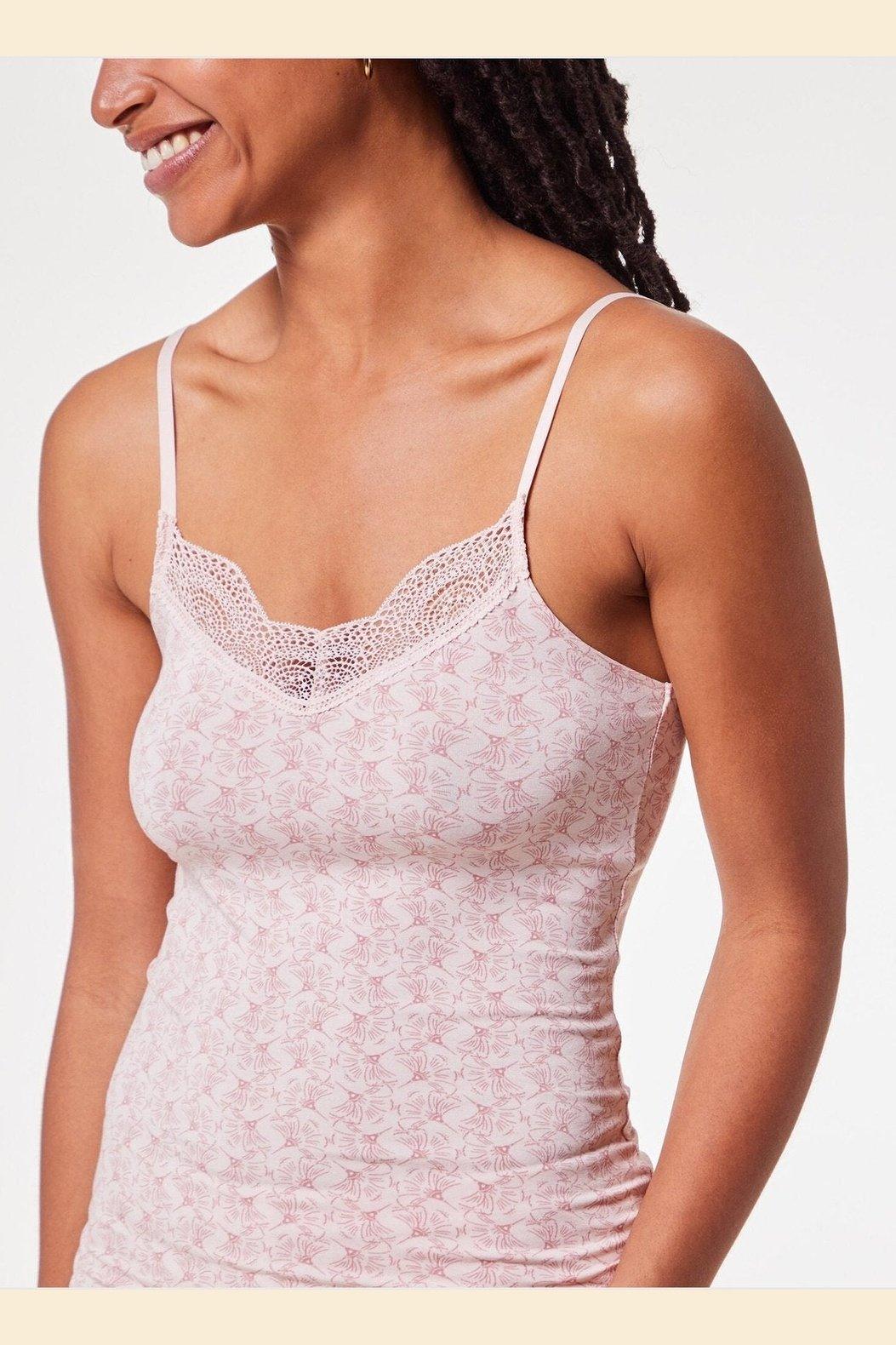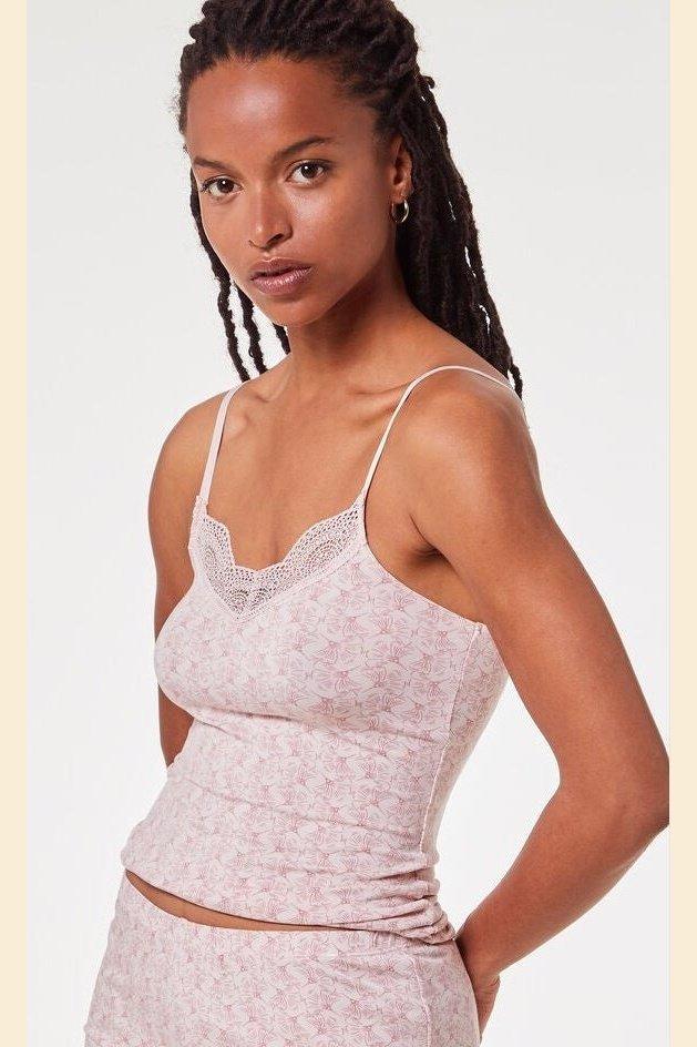 גופיית פיג'מה מבית המותג ETAM מבד ויסקוזה דק ונעים, עם הדפס פרחוני עדין בצבע ורוד, מחשוף וי מעוטר בתחרה וכתפיות דקיקות מתכווננות.