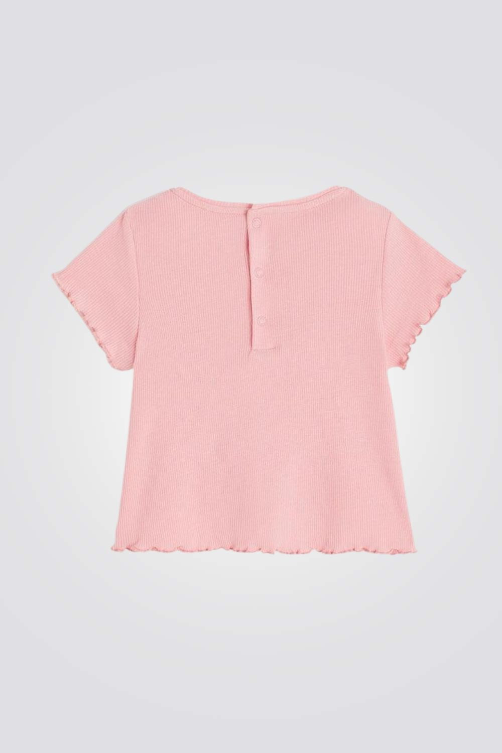חולצת סריג עם שרוולים קצרים וסגירת 3 תיקתקים בגב החולצה. מכפלות גליות בשרוולים ובחלק התחתון.