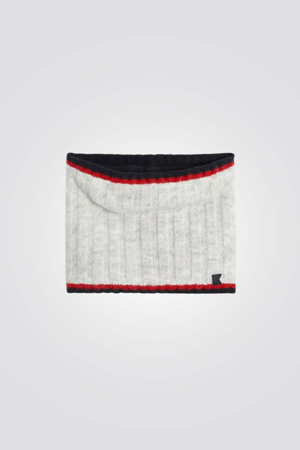 מחמם צוואר לילדים מבית המותג OKAIDI, בצבע אפור בהיר, מגן על הצוואר מפני קור, עם פליז מבפנים.
